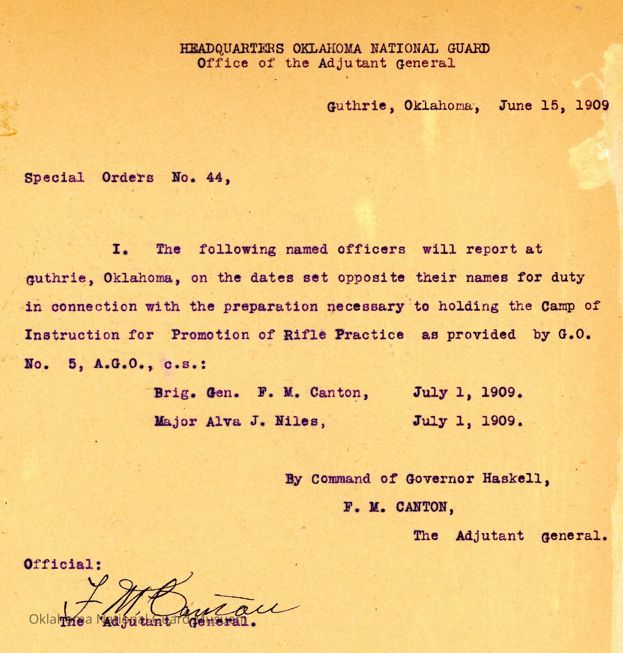 Adjutant General, Guthrie, Frank Canton, Charles Haskell, Rifle practice, Camp of Instruction, Alva J. Niles