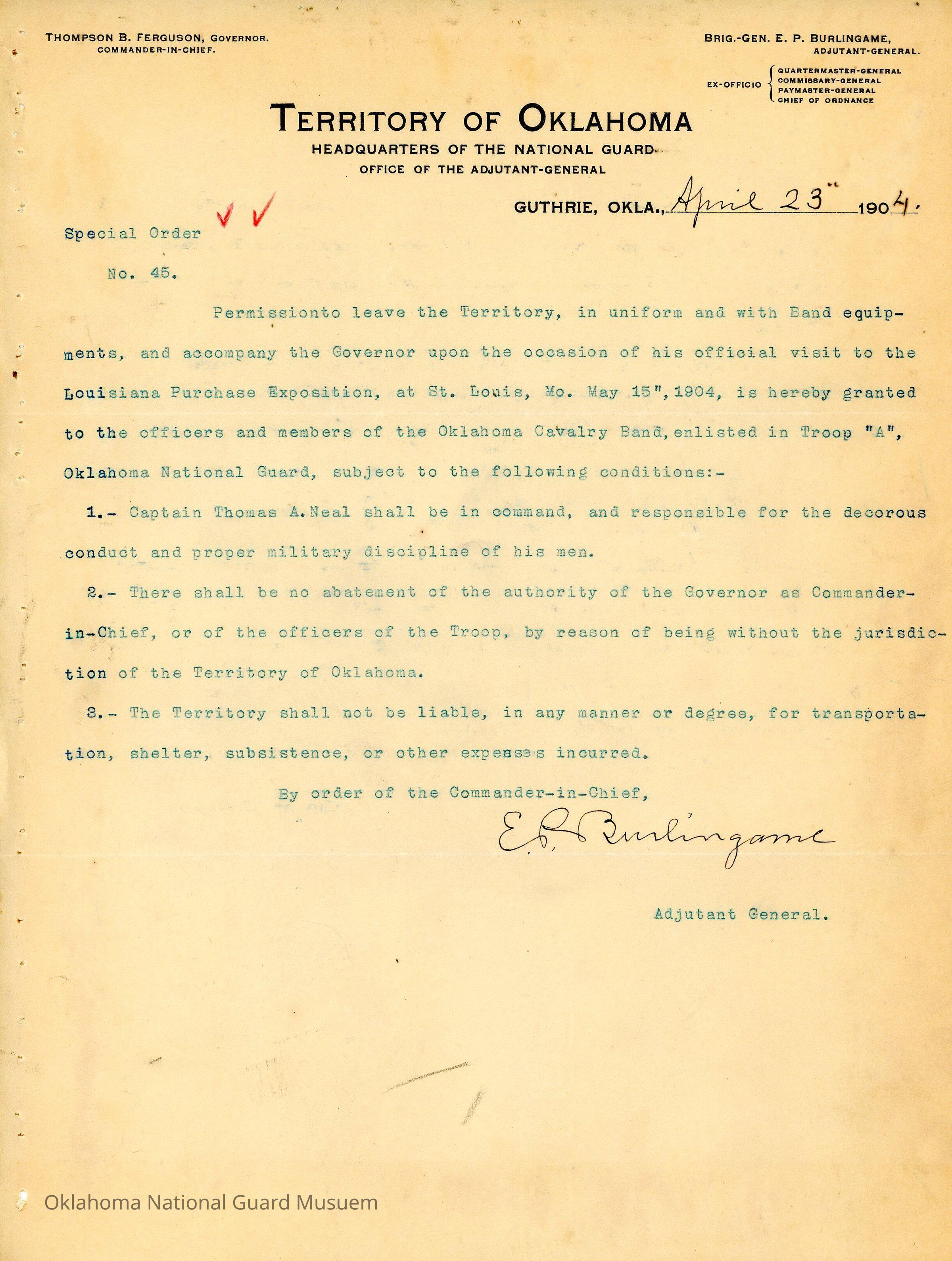 Special Order #45 from Headquarters Adjutant General's Office in Guthrie. The order grants permission for the Oklahoma Cavalry Band to leave the territory and accompany Governor Thompson B. Ferguson to the Louisiana Purchase Exposition in St. Louis, MissouriDate(s) of Creation