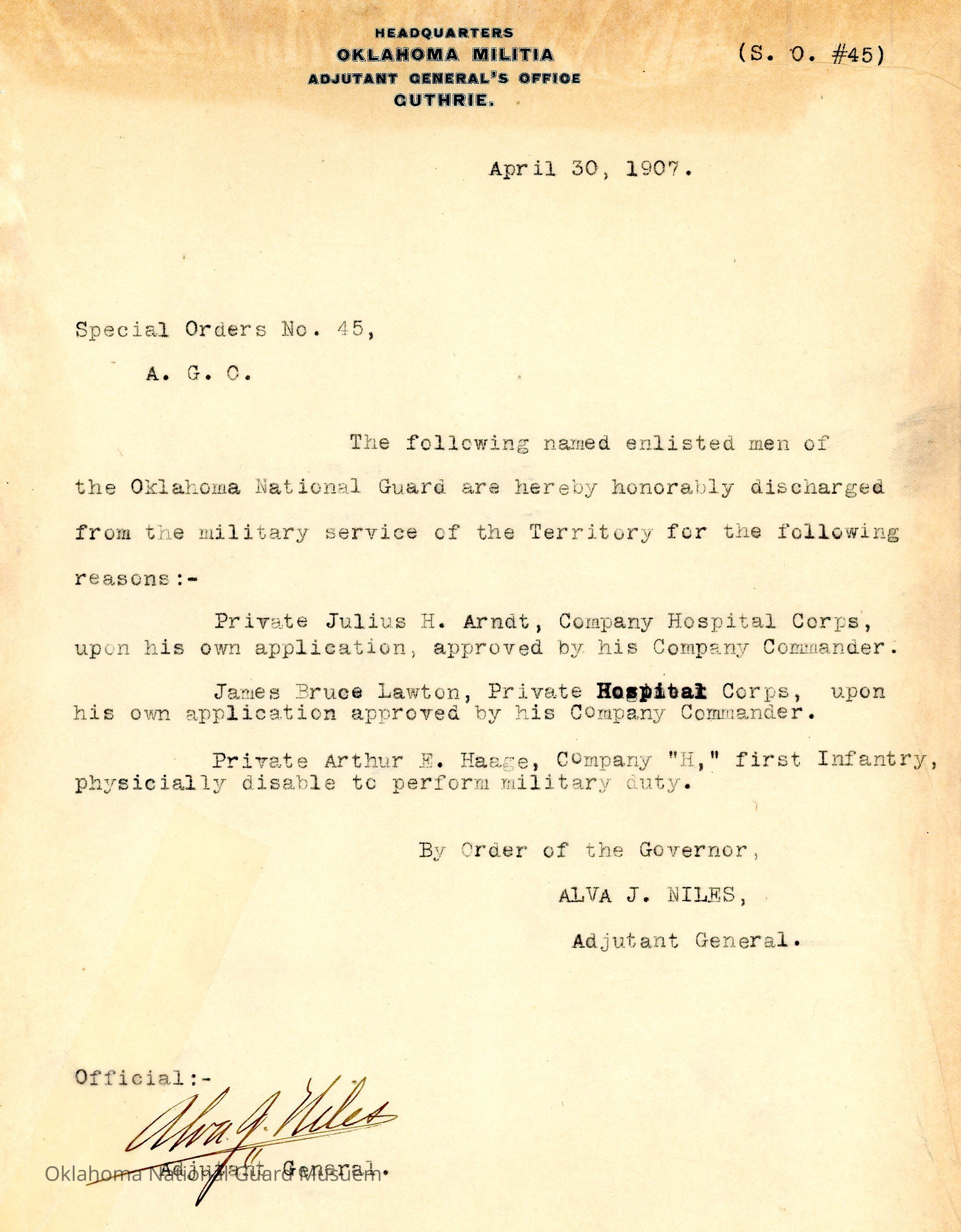 Adjutant General, Guthrie, Alva J. Niles, Honorable discharges, First Infantry, Julius H. Arndt, James Bruce Lawton, Arthur E. Haage