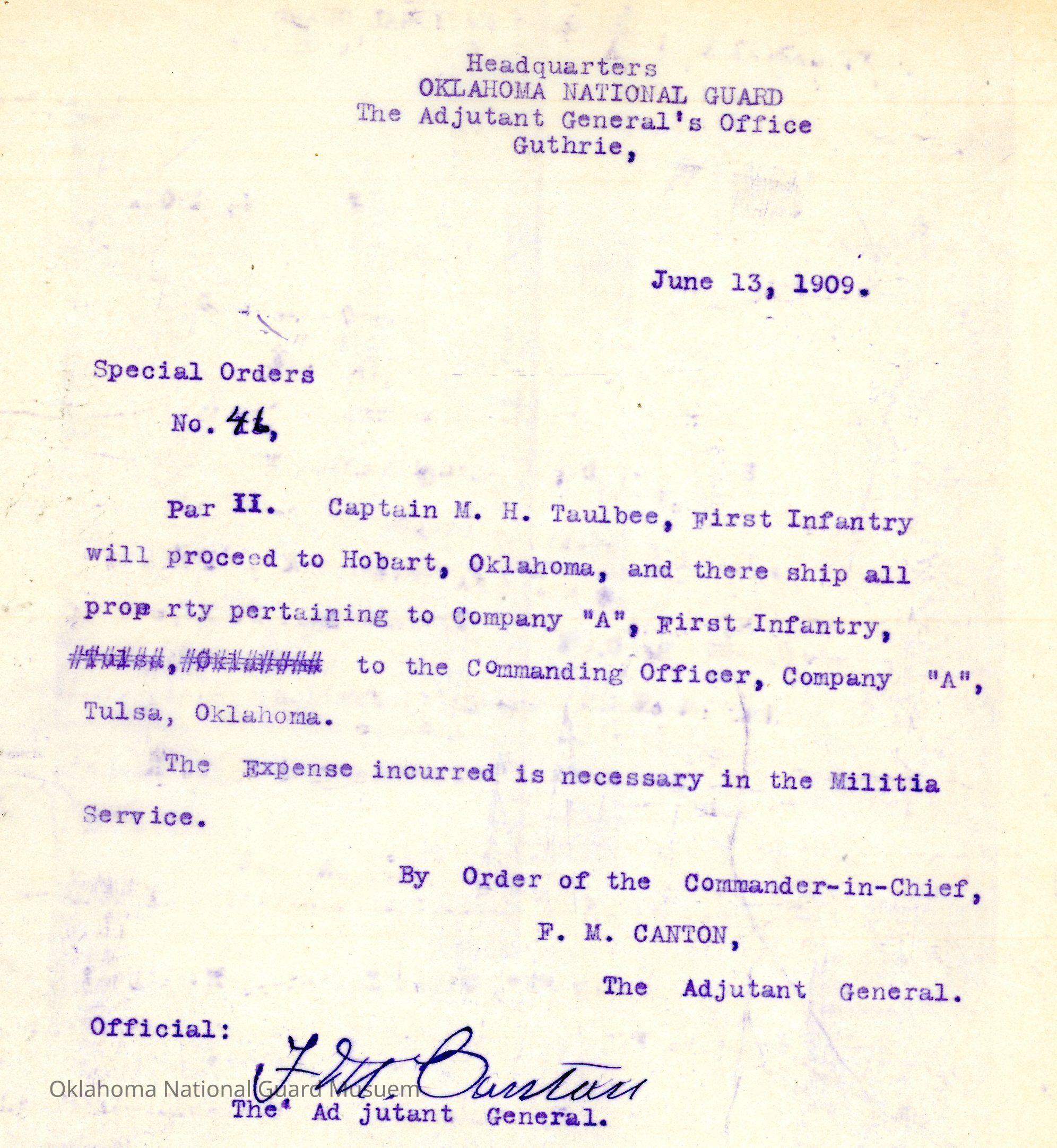 Special Order #46 from Headquarters Adjutant General's Office in Guthrie. The order instructs M.H. Taulbee to travel to Hobart to collect property pertaining to Company A and ship it to TulsaDate(s) of Creation