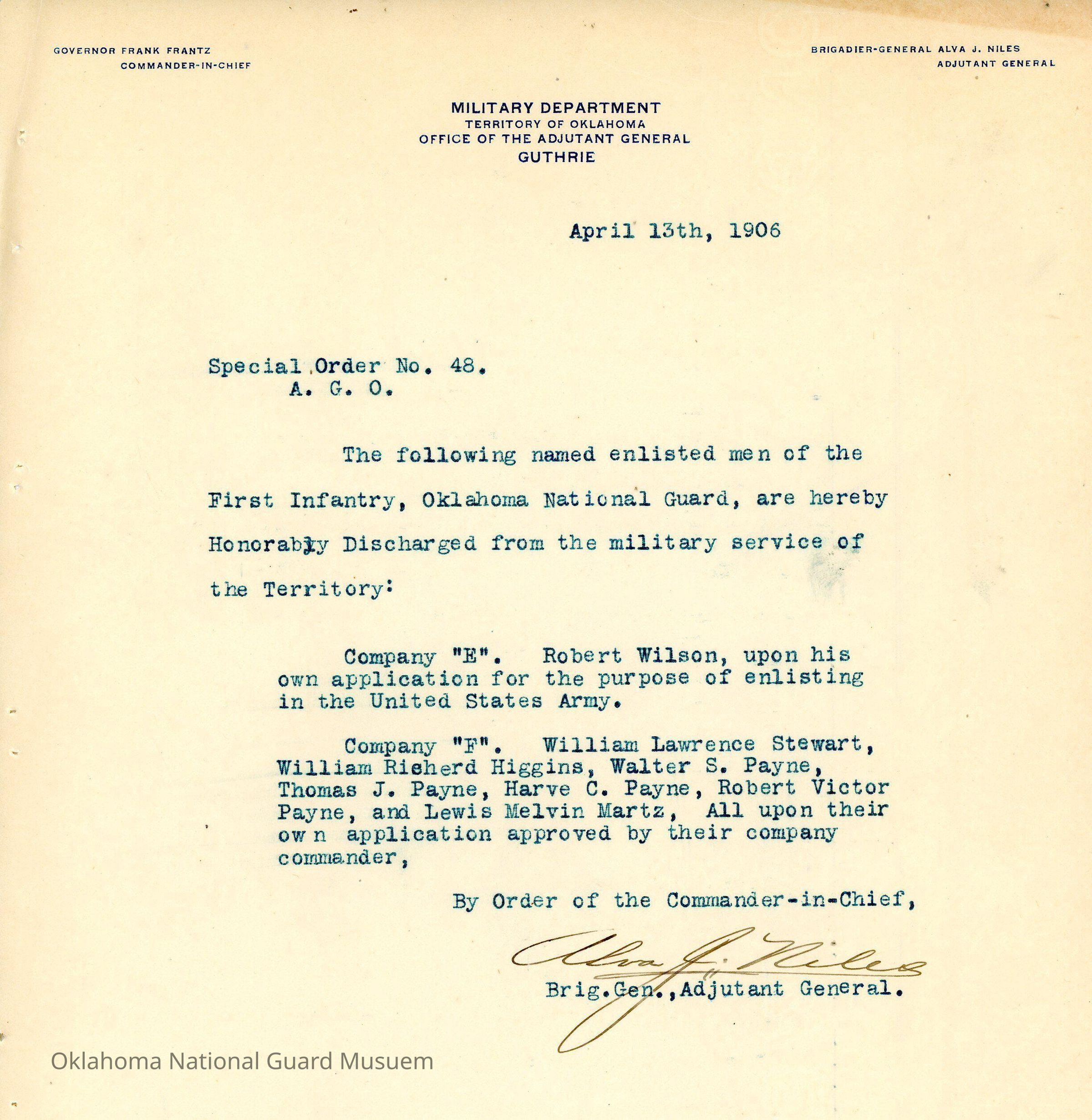 Adjutant General, Guthrie, Frank Frantz, Alva J. Niles, First Regiment, Honorable discharges, Robert Wilson, William Lawrence Stewart, William Richerd Higgins, Walter S. Payne, Thomas J. Payne, Harve C. Payne, Robert Victor Payne, Lewis Melvin Martz