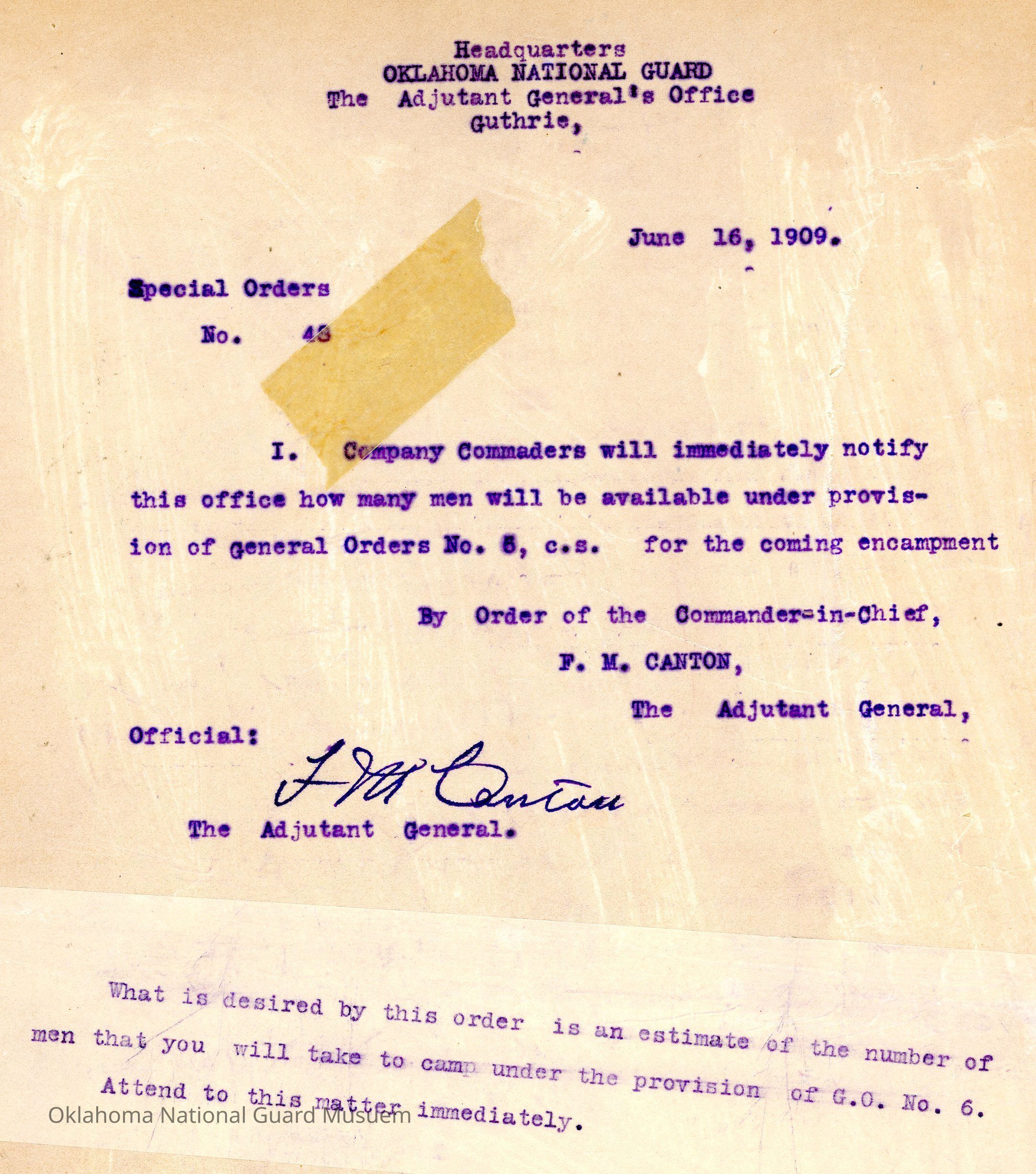 Special Order #48 from Headquarters Adjutant General's Office in Guthrie. The order instructs company commanders to provide a list of the number of men under their command who will be at the Camp of Instruction under the provision of General Order #6 1909Date(s) of Creation