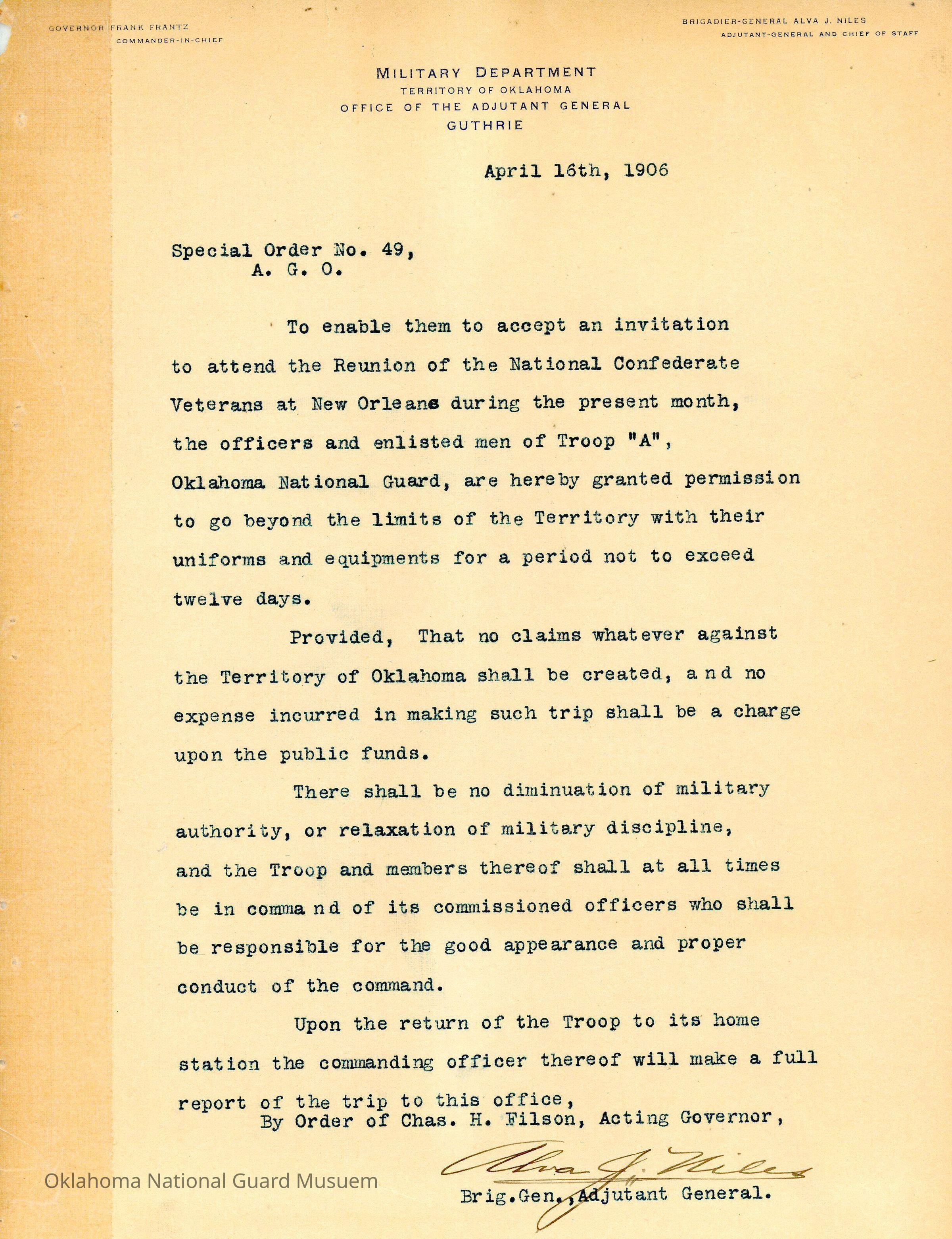 Special Order #49 from Headquarters Adjutant General's Office in Guthrie. The order allows Troop A to travel to New Orleans for the Reunion of the National Confederate VeteransDate(s) of Creation