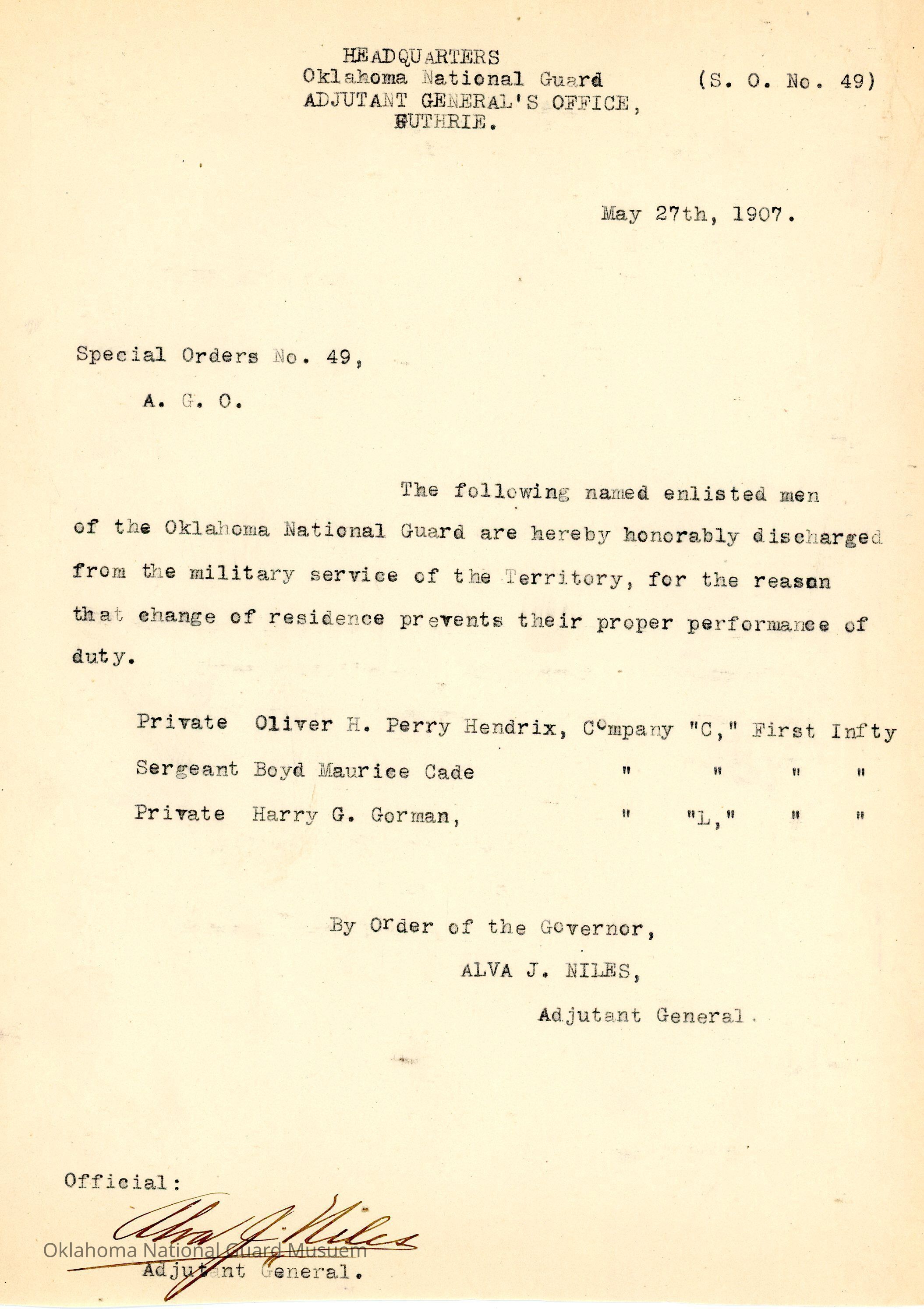Adjutant General, Guthrie, Alva J. Niles, Honorable discharges, First Infantry, Oliver H. Perry Hendrix, Boyd Maurice Cade, Harry G. Gorman
