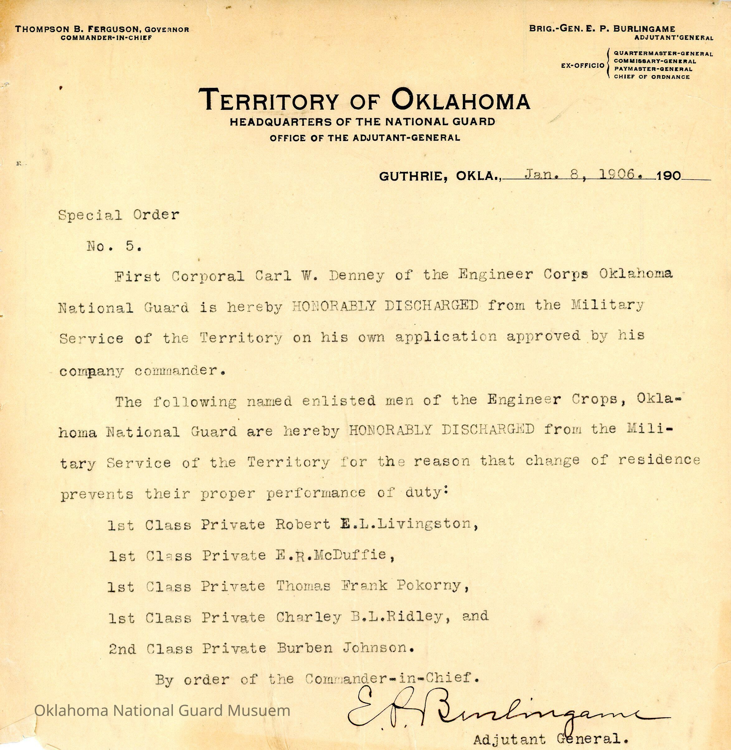 Adjutant General, Guthrie, E.P. Burlingame, Thompson B. Ferguson, Engineer Corps, Honorable discharges, Carl W. Denney, Robert E.L. Livingston, E.R. McDuffie, Thomas Frank Pokorny, Charley B.L. Ridley, Burben Johnson