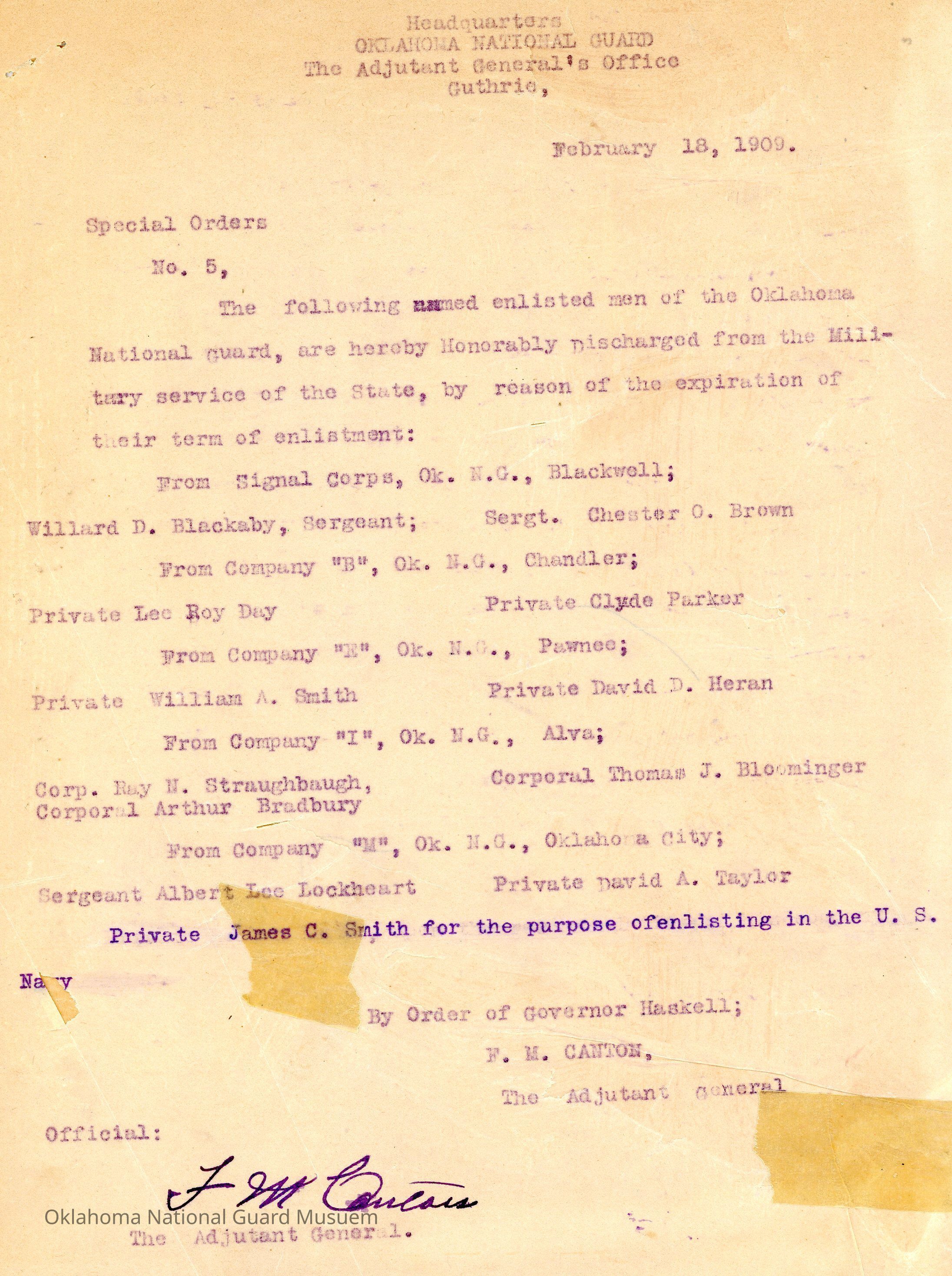Adjutant General, Guthrie, Frank Canton, Charles Haskell, First Infantry, Honorable discharges, Blackwell, Willard D. Blackaby, Chester O. Brown, Chandler, Lee Roy Day, Clyde Parker, Pawnee, William A. Smith, David D. Heran, Alva, Ray N. Straughbaugh, Arthur Bradbury, Thomas J. Bloominger, Oklahoma City, Albert Lee Lockheart, David A. Taylor, James C. Smith, Navy