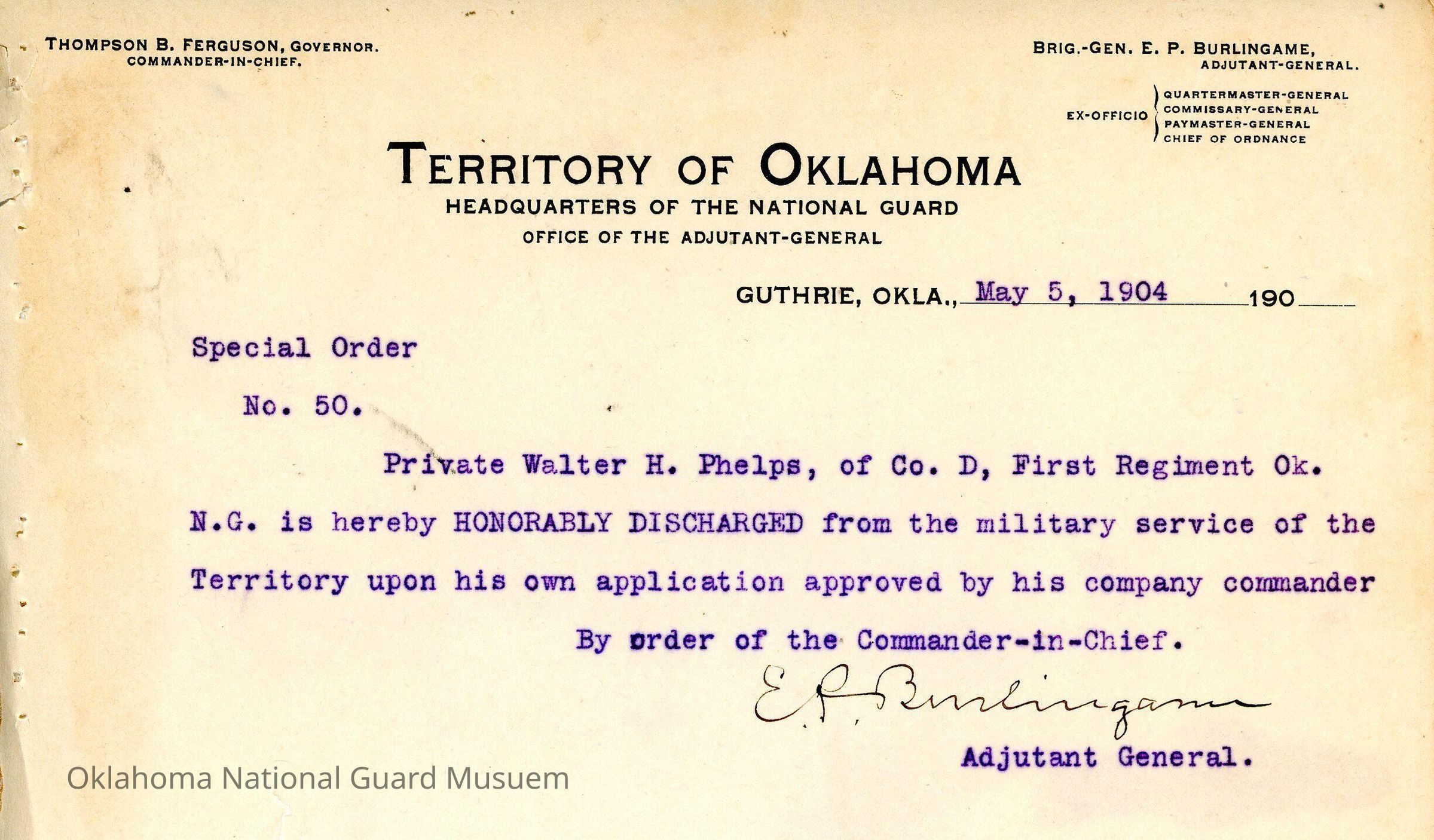 Adjutant General, Guthrie, E.P. Burlingame, Thompson B. Ferguson, First Regiment, Honorable discharges, Walter H. Phelps