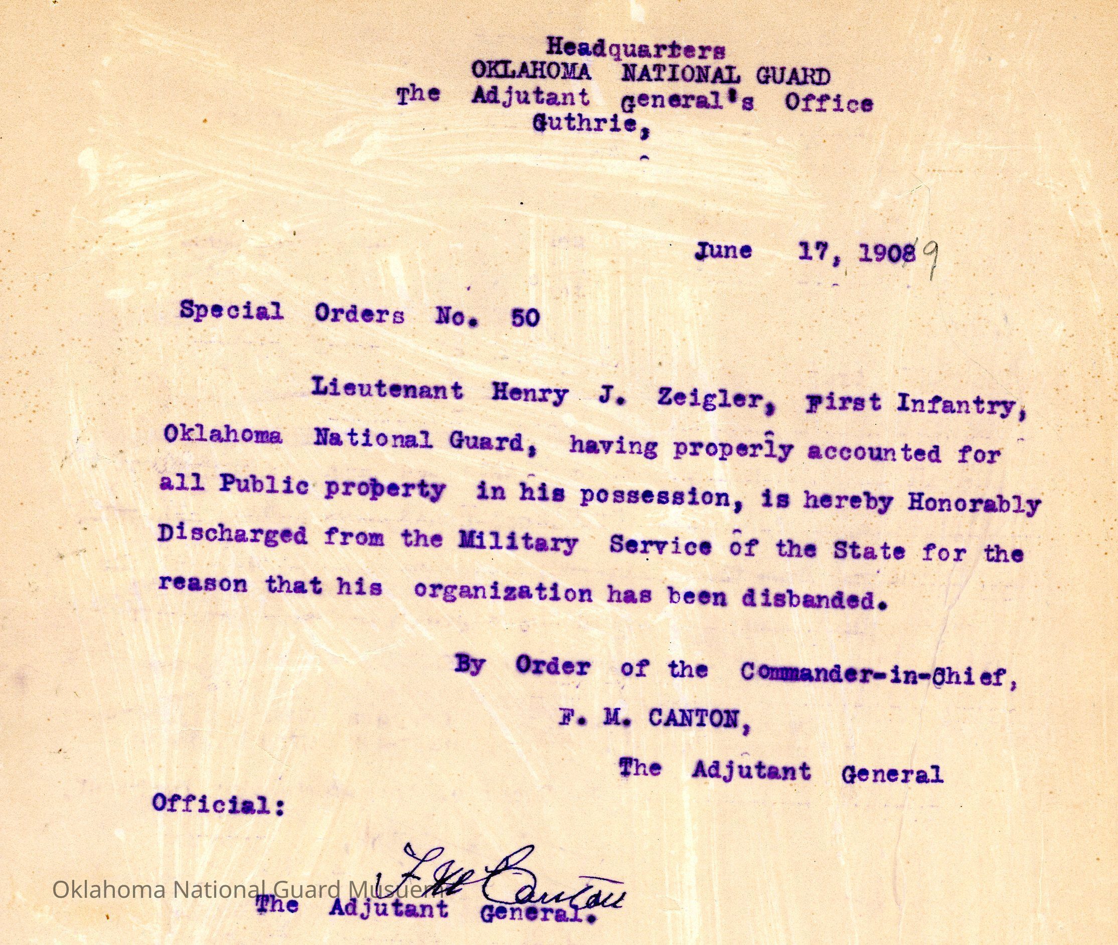 Special Order #50 from Headquarters Adjutant General's Office in Guthrie. The order lists the honorable discharge of Henry J. ZeiglerDate(s) of Creation