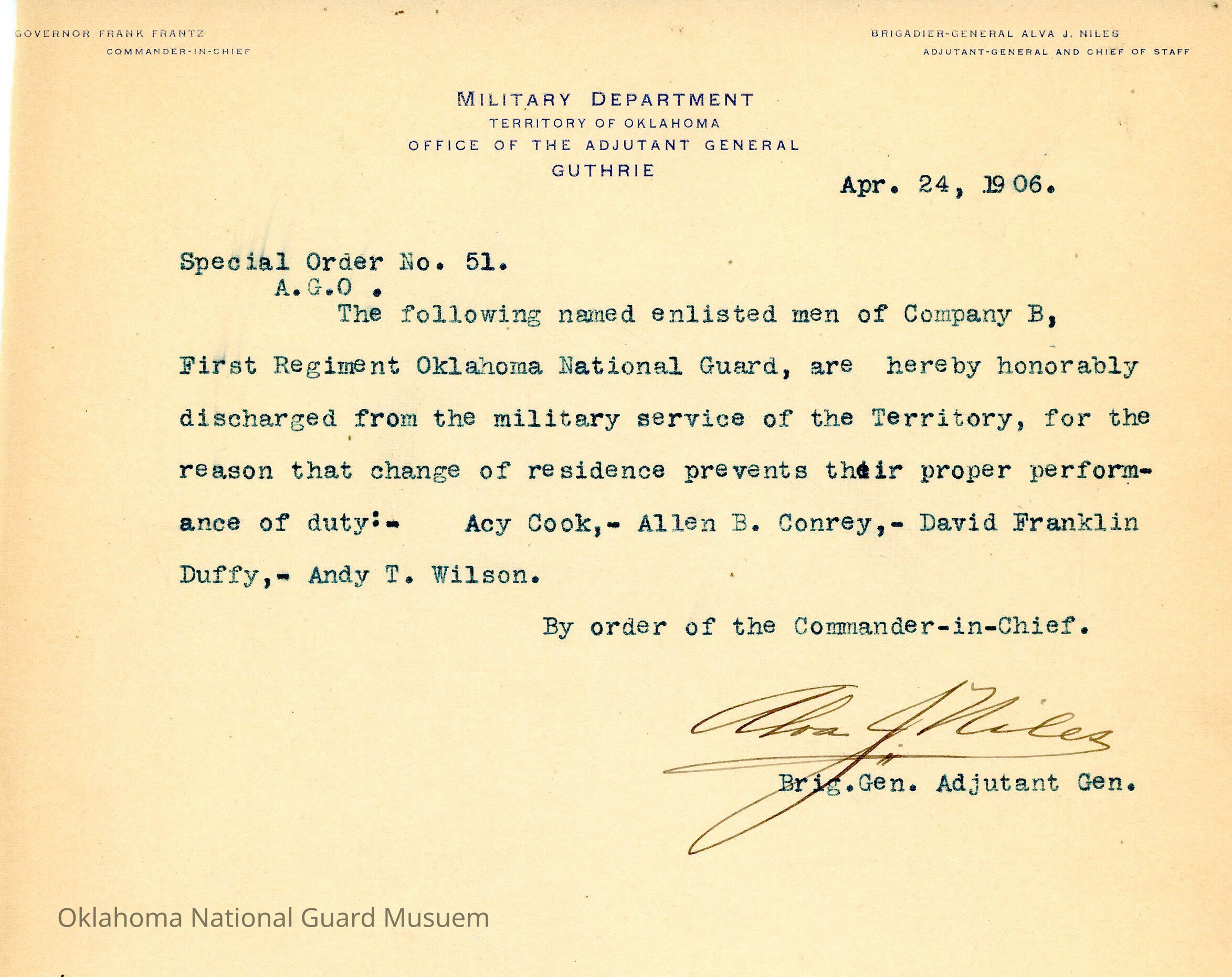 Adjutant General, Guthrie, Frank Frantz, Alva J. Niles, First Regiment, Honorable discharges, Acy Cook, Allen B. Conrey, David Franklin Duffy, Andy T. Wilson