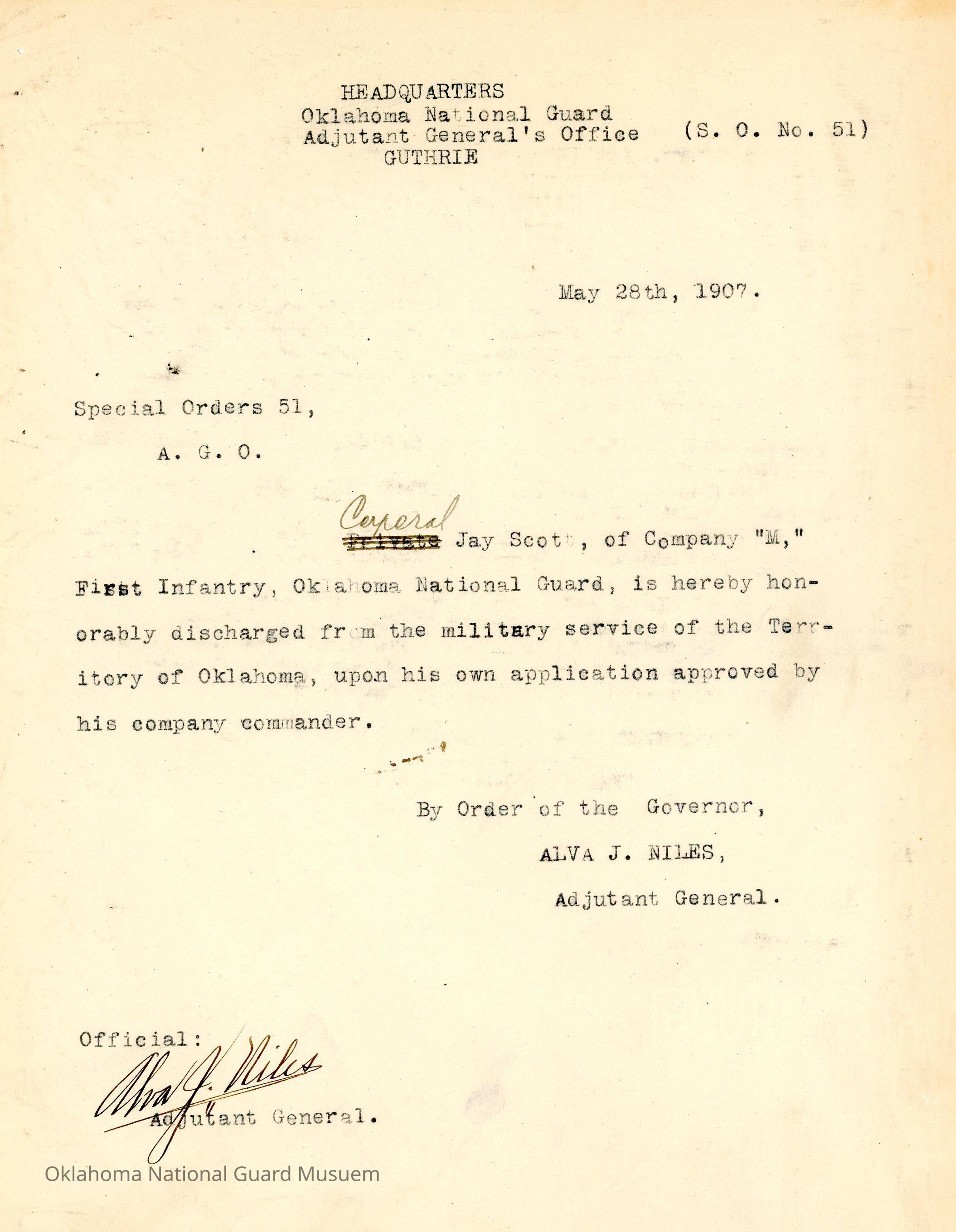 Adjutant General, Guthrie, Alva J. Niles, Honorable discharges, First Infantry, Jay Scott