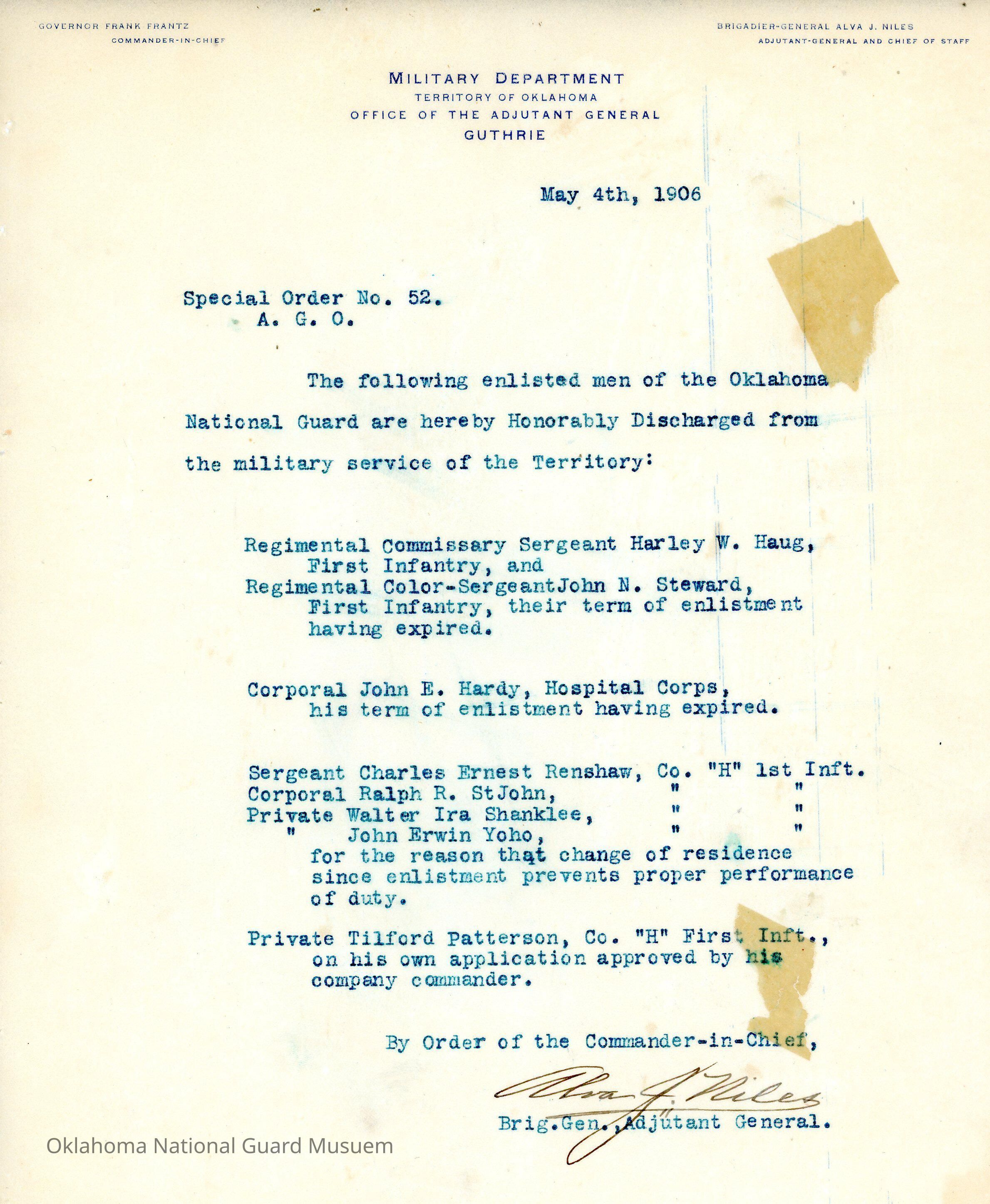Special Order #52 from Headquarters Adjutant General's Office in Guthrie. The order lists the honorable discharges in First Regiment and Hospital CorpsDate(s) of Creation