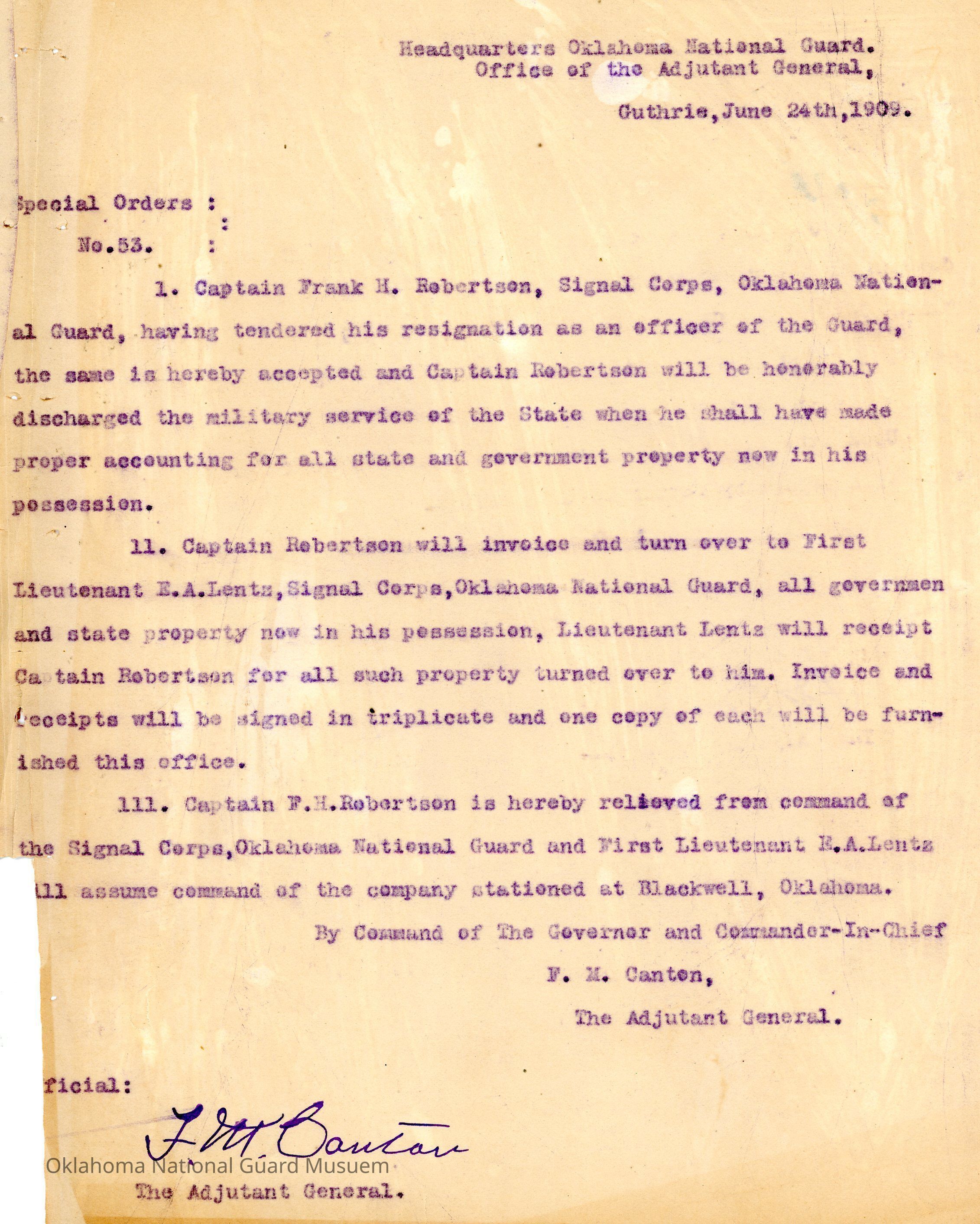 Special Order #53 from Headquarters Adjutant General's Office in Guthrie. The order honorably discharges Frank H. Robertson of Signal Corps and instructs Robertson to turn over all state property in his possession to E.A. Lentz who will assume command of Signal Corps stationed in BlackwellDate(s) of Creation