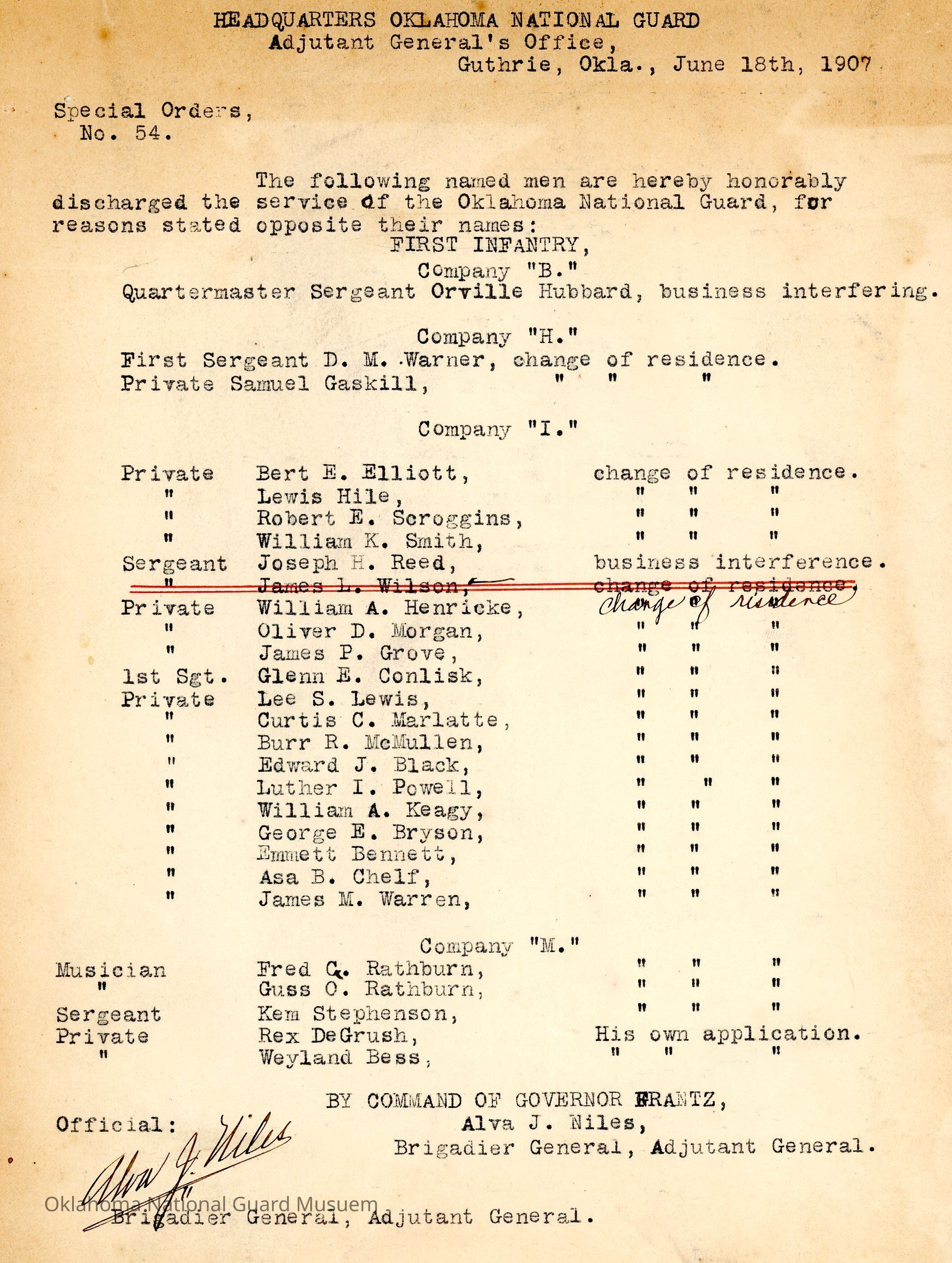 Adjutant General, Guthrie, Alva J. Niles, Honorable discharges, First Infantry, Orville Hubbard, D.M. Warner, Samuel Gaskill, Bert E. Elliott, Lewis Hile, Robert E. Scroggins, William K. Smith, Joseph H. Reed, William A. Henricke, Oliver D. Morgan, James P. Grove, Glenn E. Conlisk, Lee S. Lewis, Curtis C. Marlatte, Burr R. McMullen, Edward J. Black, Luther I. Powell, William A. Keagy, George E. Bryson, Emmett Bennett, Asa B. Chelf, James M. Warren, Fred C. Rathburn, Guss O. Rathburn, Kem Stephenson, Rex DeGrush, Weyland Bess, Frank Frantz