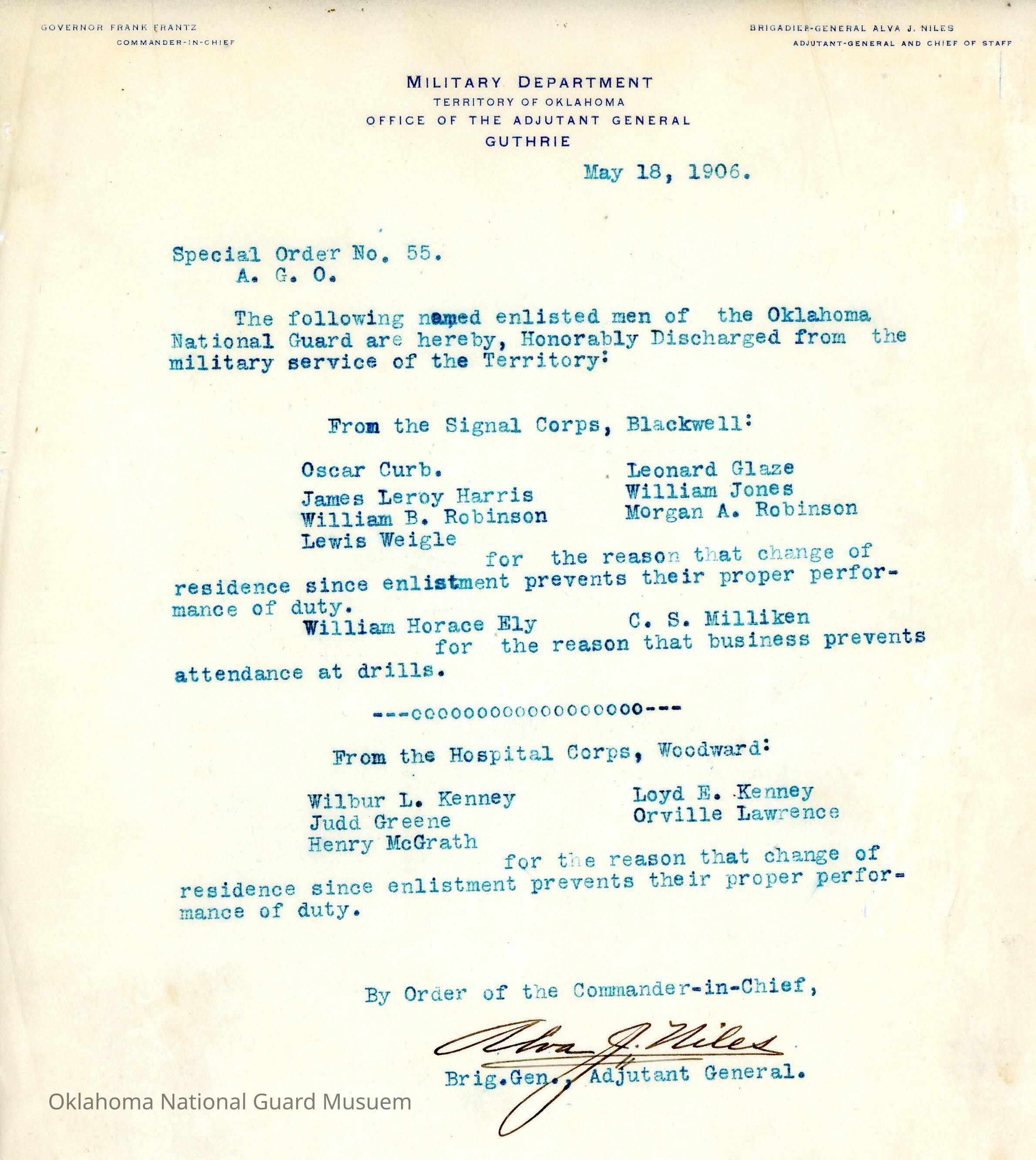 Adjutant General, Guthrie, Frank Frantz, Alva J. Niles, Hospital Corps, Honorable discharges, Signal Corps, Blackwell, Oscar Curb, James Leroy Harris, William B. Robinson, Lewis Weigle, Leonard Glaze, William Jones, Morgan A. Robinson, William Horace Ely, C.S. Milliken, Woodward, Wilbur L. Kenney, Judd Greene, Henry McGrath, Loyd E. Kenney, Orville Lawrence