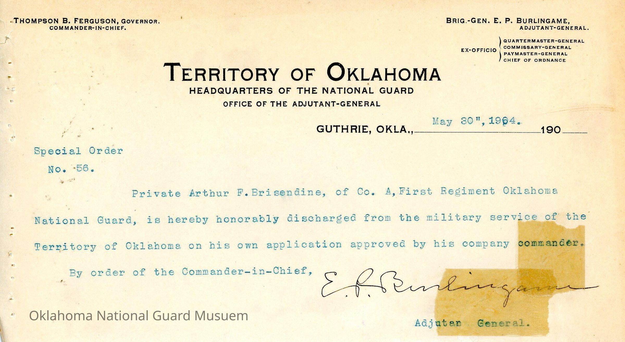 Adjutant General, Guthrie, E.P. Burlingame, Thompson B. Ferguson, First Regiment, Honorable discharges, Arthur F. Brisendine
