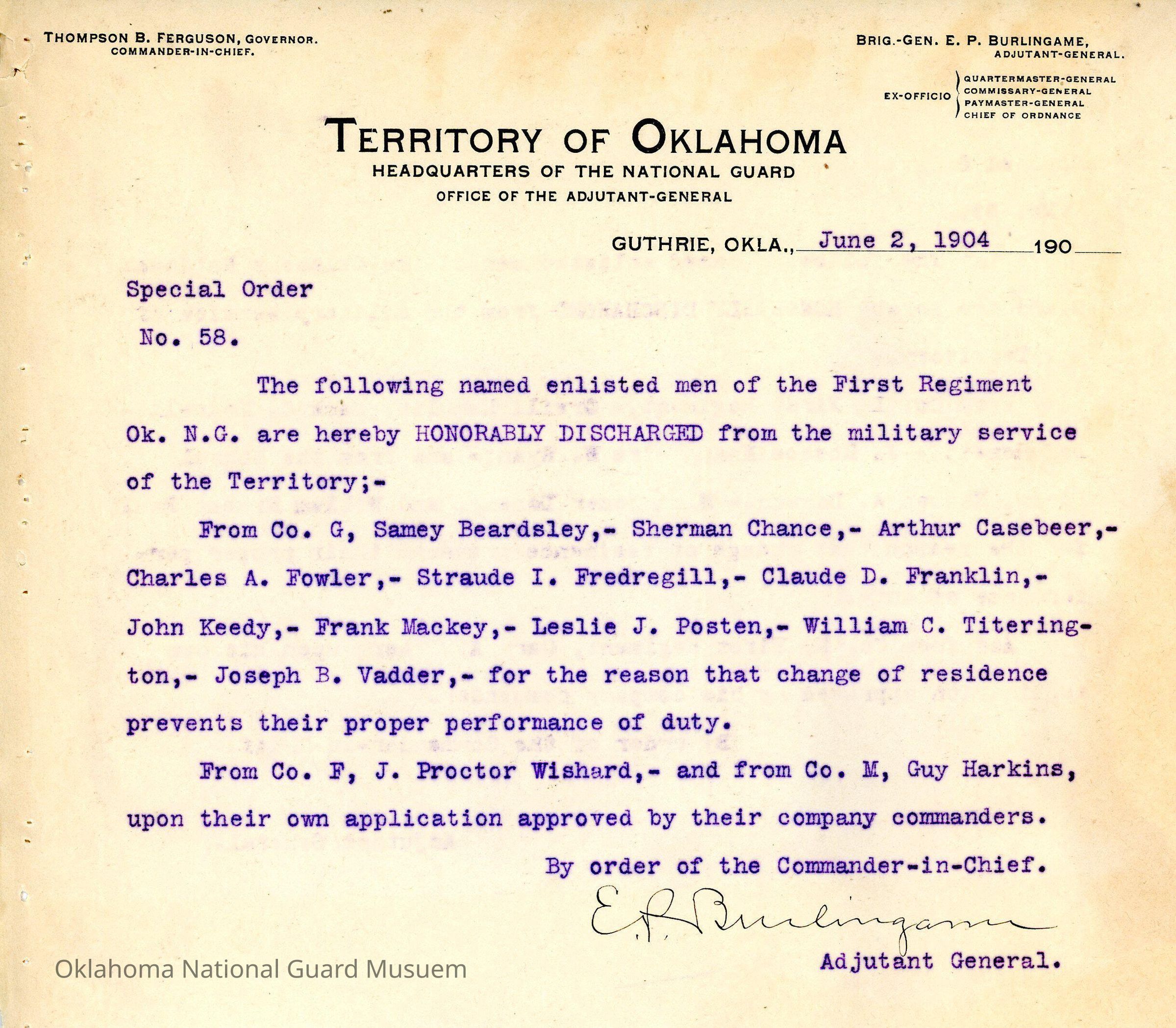 Adjutant General, Guthrie, E.P. Burlingame, Thompson B. Ferguson, First Regiment, Honorable discharges, Samey Beardsley, Sherman Chance, Arthur Casebeer, Charles A. Fowler, Straude I. Fredregill, Clade D. Franklin, John Keedy, Frank Mackey, Leslie J. Posten, William C. Titerington, Joseph B. Vadder, J. Proctor Wishard, Guy Harkins