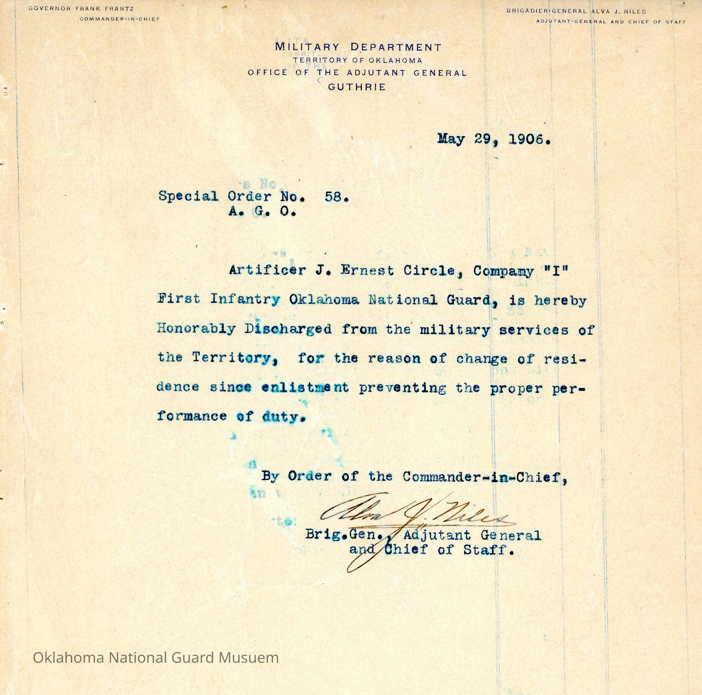 Adjutant General, Guthrie, Frank Frantz, Alva J. Niles, First Regiment, Honorable discharges, J. Ernest Circle