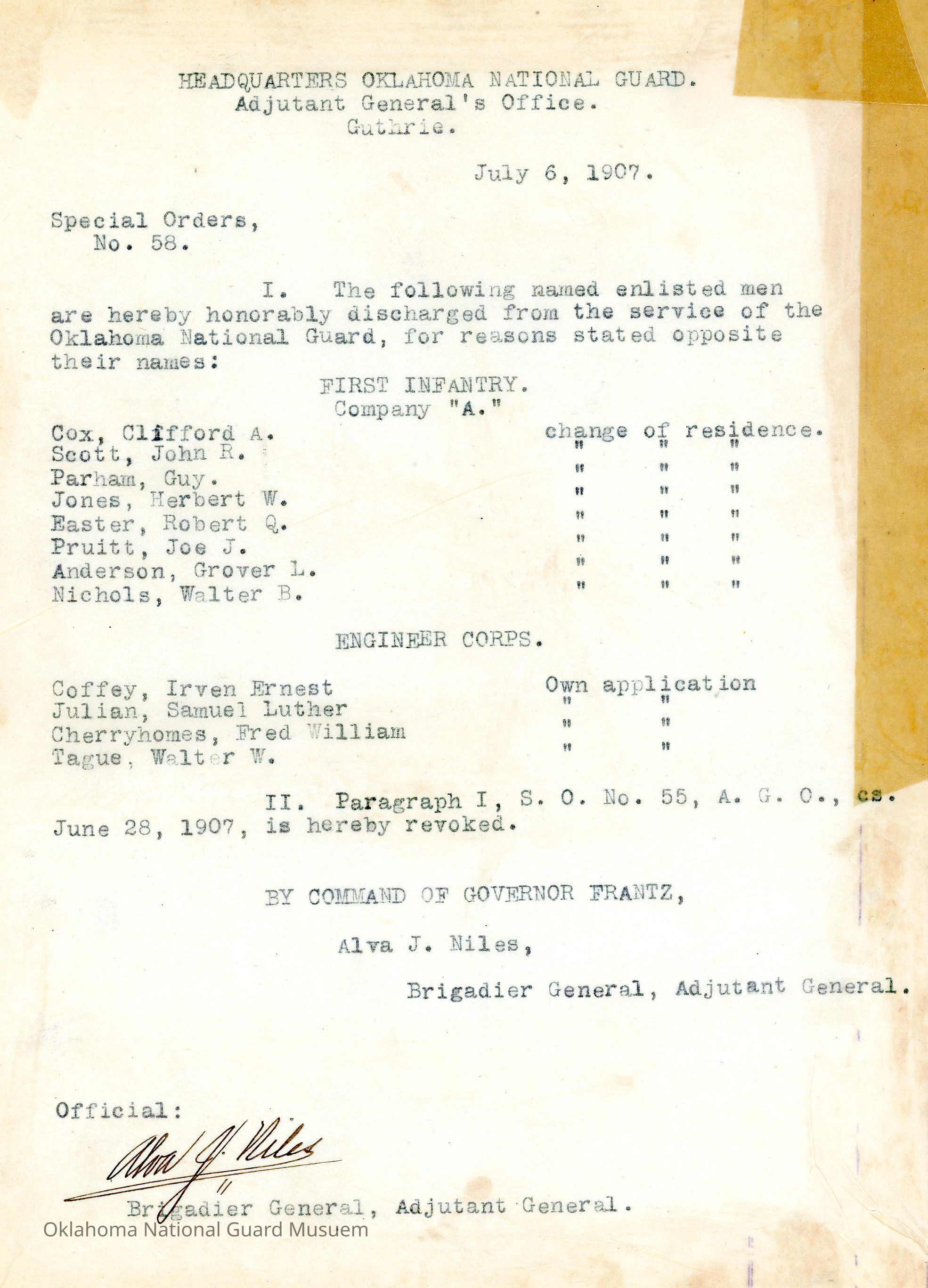 Adjutant General, Guthrie, Alva J. Niles, Honorable discharges, Engineer Corps, First Infantry, Clifford A. Cox, John R. Scott, Guy Parham, Herbert W. Jones, Robert Q. Easter, Joe J. Pruitt, Grover L. Anderson, Walter B. Nichols, Irven Ernest Coffey, Samuel Luther Julian, Fred William Cherryhomes, Walter W. Tagus, Frank Frantz