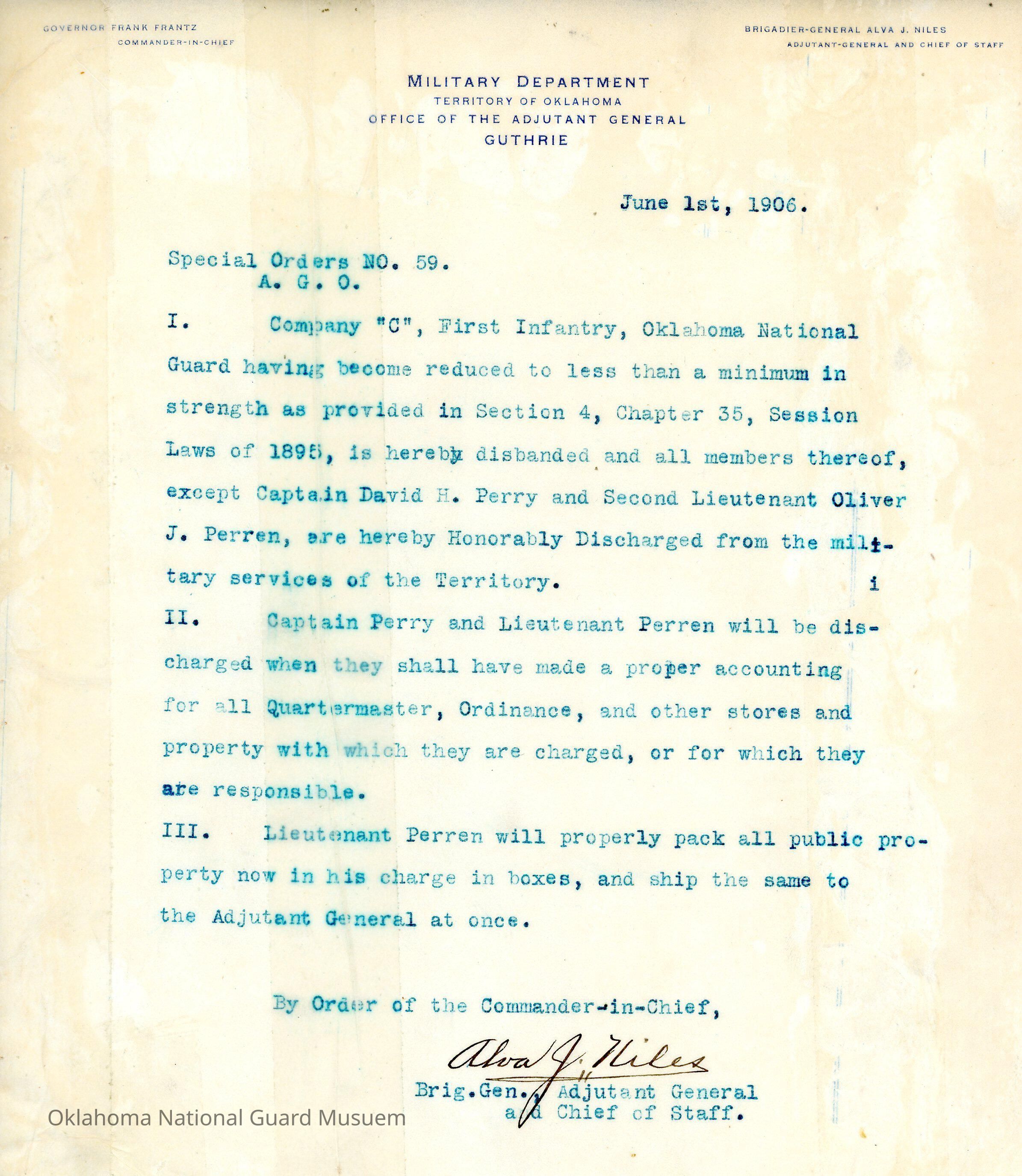 Adjutant General, Guthrie, Frank Frantz, Alva J. Niles, Disband, First Regiment, Honorable discharges, David H. Perry, Oliver J. Perren