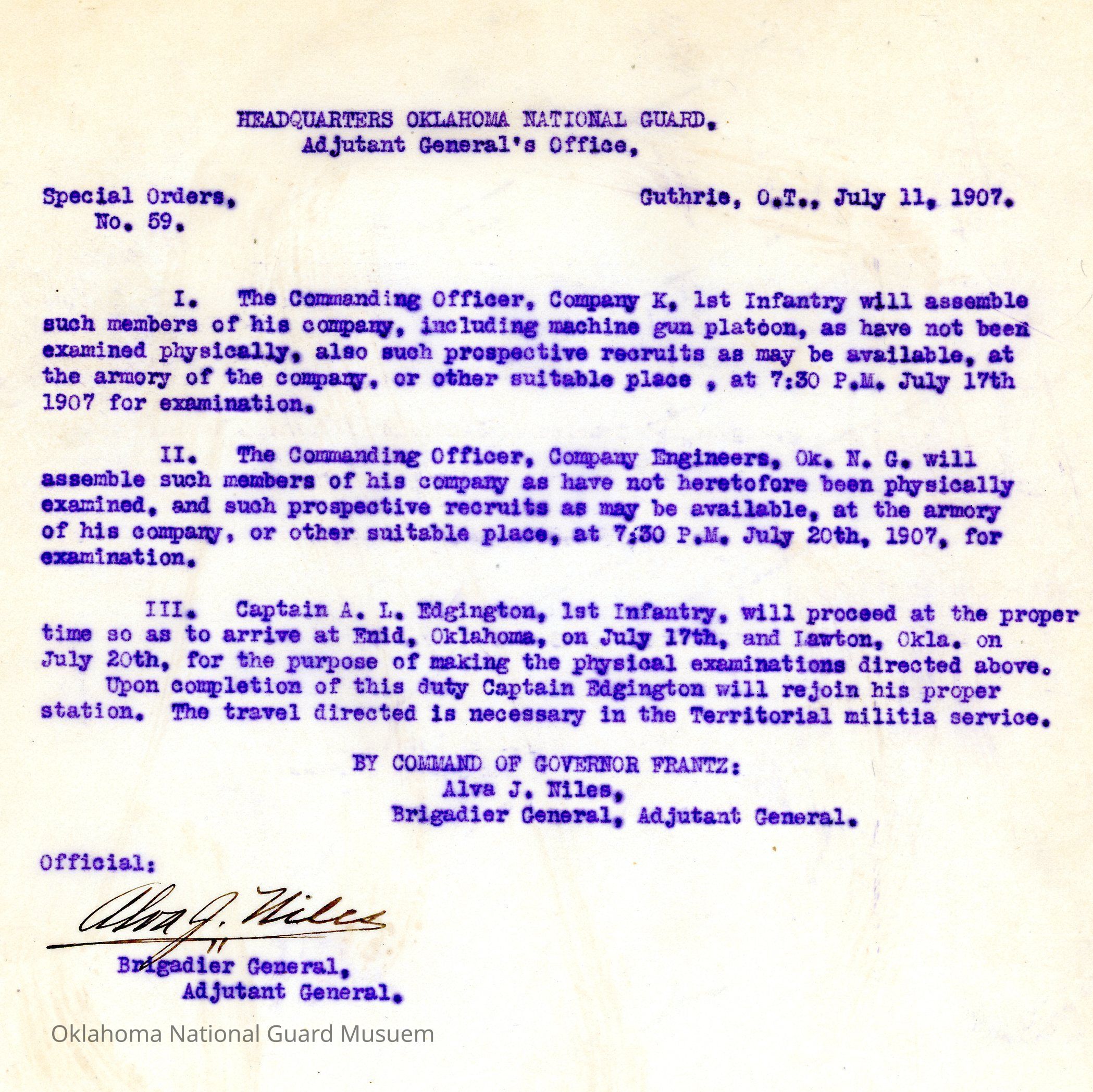 Special Order #59 from Headquarters Adjutant General's Office in Guthrie. The order instructs A.L. Edgington to provide physical examinations to Company K First Infantry and Engineer CorpsDate(s) of Creation