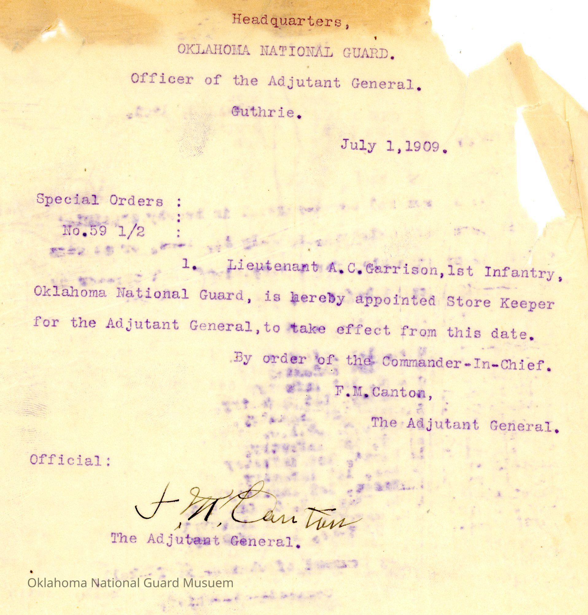 Special Order #59.5 from Headquarters Adjutant General's Office in Guthrie. The order appoints A.C. Garrison as the Military Store keeper for the Adjutant GeneralDate(s) of Creation