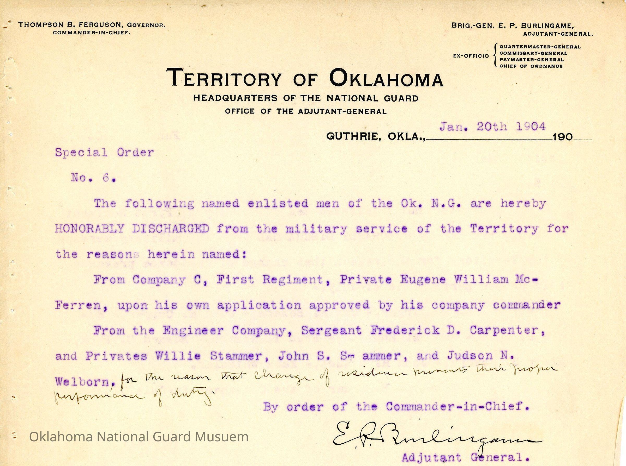 Adjutant General, Guthrie, E.P. Burlingame, Thompson B. Ferguson, First Regiment, Honorable discharges, Eugene William McFerren, Engineer Company, Frederick D. Carpenter, Willie Stammer, John S. Stammer, Judson N. Welborn