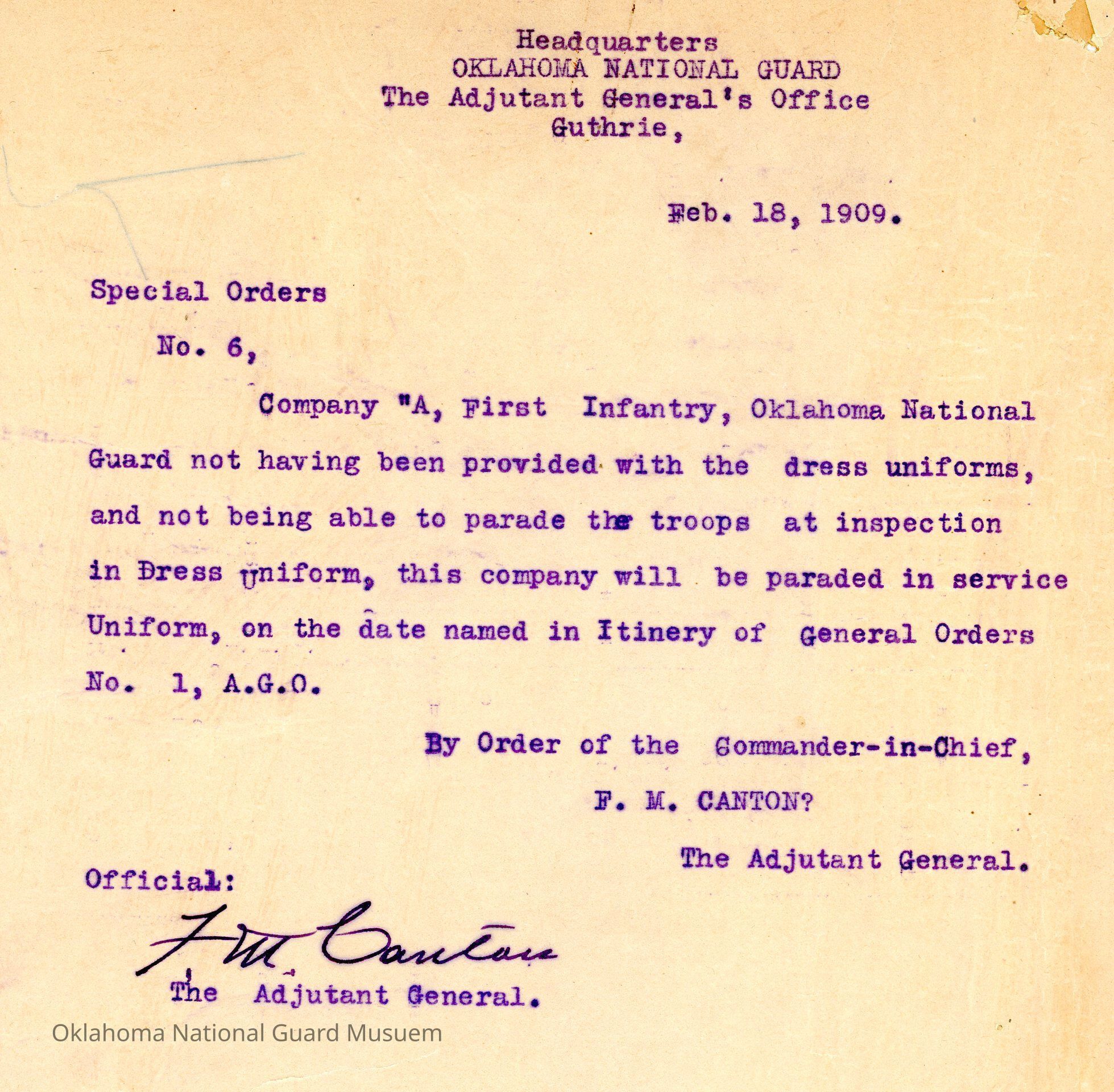 Special Order #6 from Headquarters Adjutant General's Office in Guthrie. The order instructs Company A First Infantry to parade in their service uniform since they were not provided dress uniforms as required in General Order #1 1909Date(s) of Creation