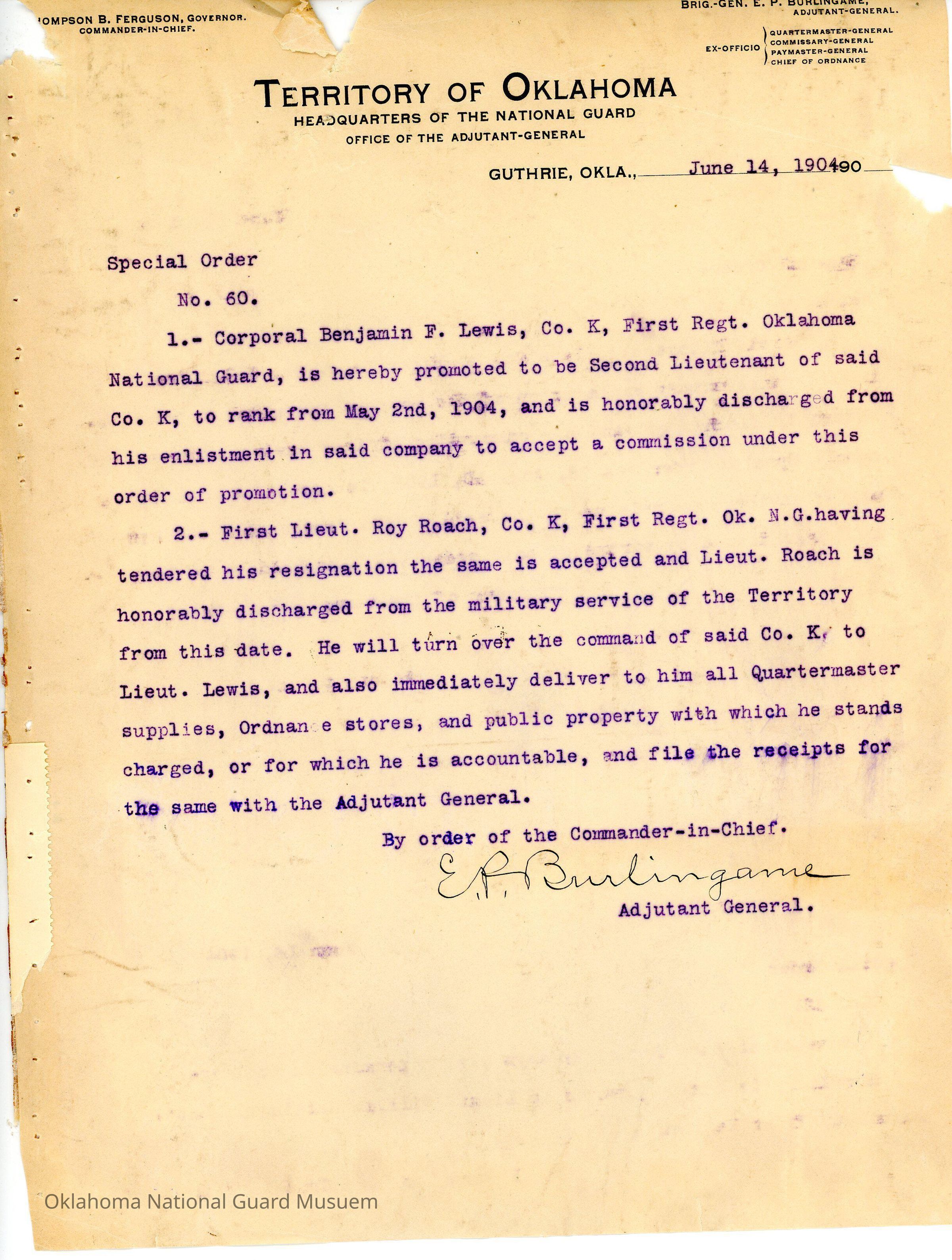 Special Order #60 from Headquarters Adjutant General's Office in Guthrie. The order promotes Benjamin F. Lewis and discharges him from his enlistment. Ray Roach resigned from Company K First Regiment and Lewis will take his place as commander of K CompanyDate(s) of Creation