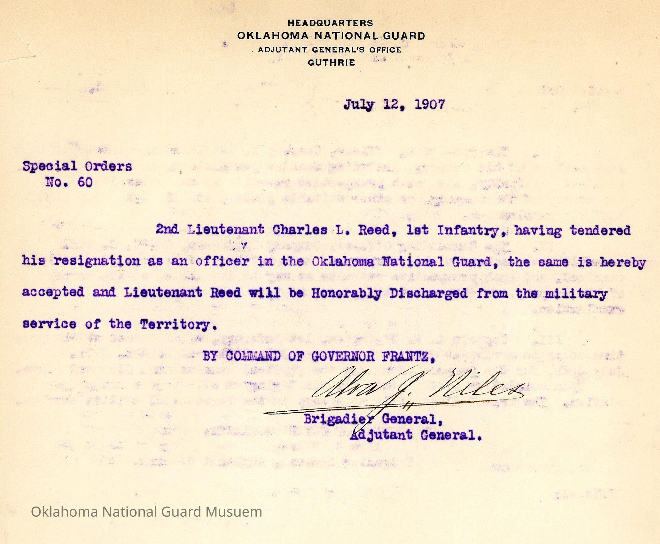 Adjutant General, Guthrie, Alva J. Niles, Honorable discharges, First Infantry, Resignation, Charles L. Reed, Frank Frantz