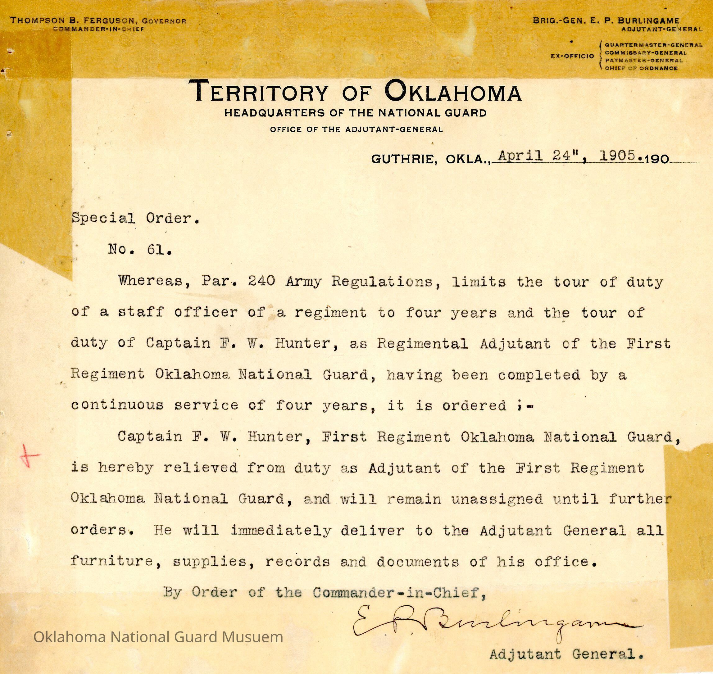 Adjutant General, Guthrie, E.P. Burlingame, Thompson B. Ferguson, F.W. Hunter, First Regiment, Army regulations