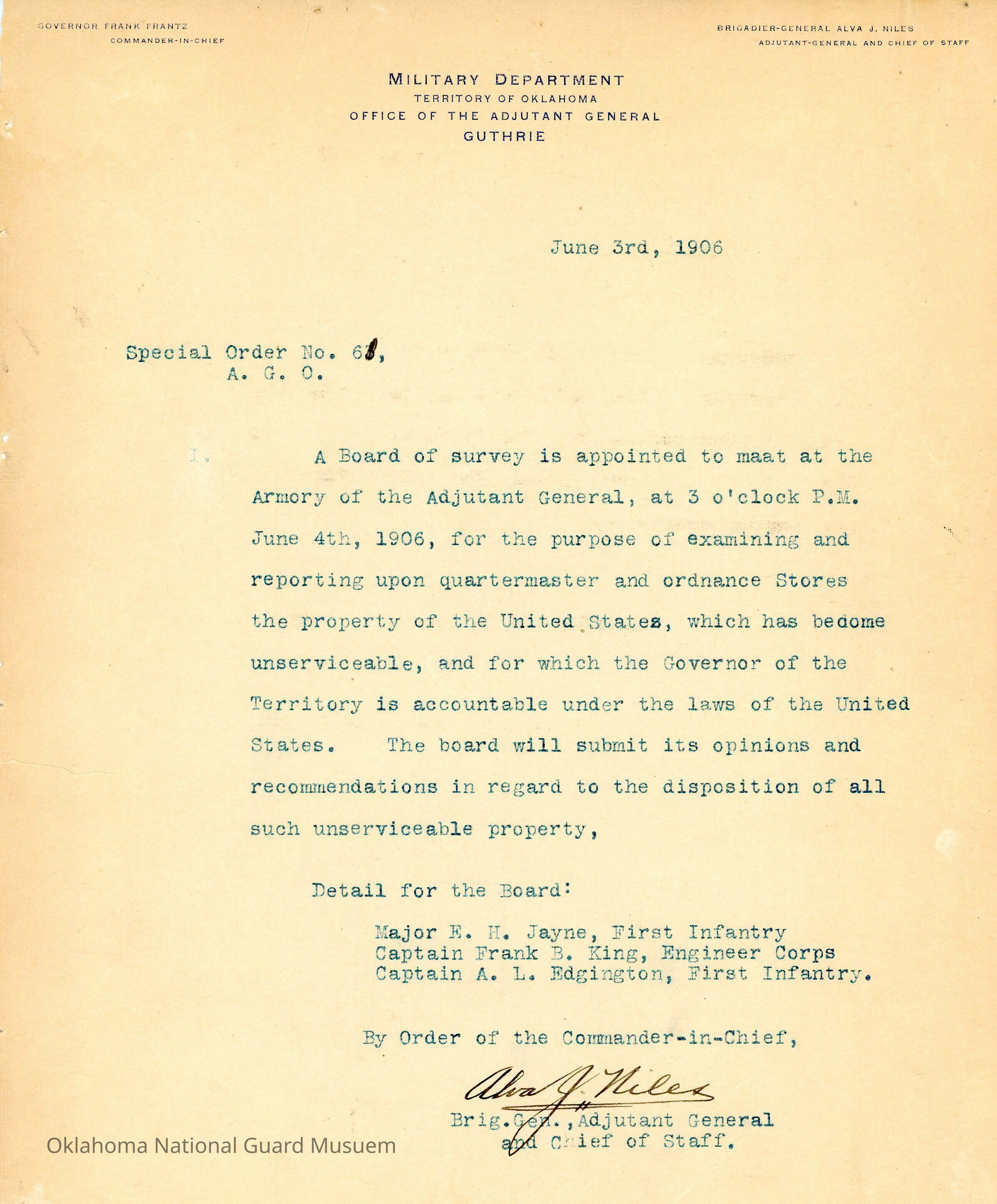Special Order #61 from Headquarters Adjutant General's Office in Guthrie. The order appoints a Board of Survey to investigate all matters relating to public property issued by the federal government for use in the Oklahoma National Guard.Date(s) of Creation