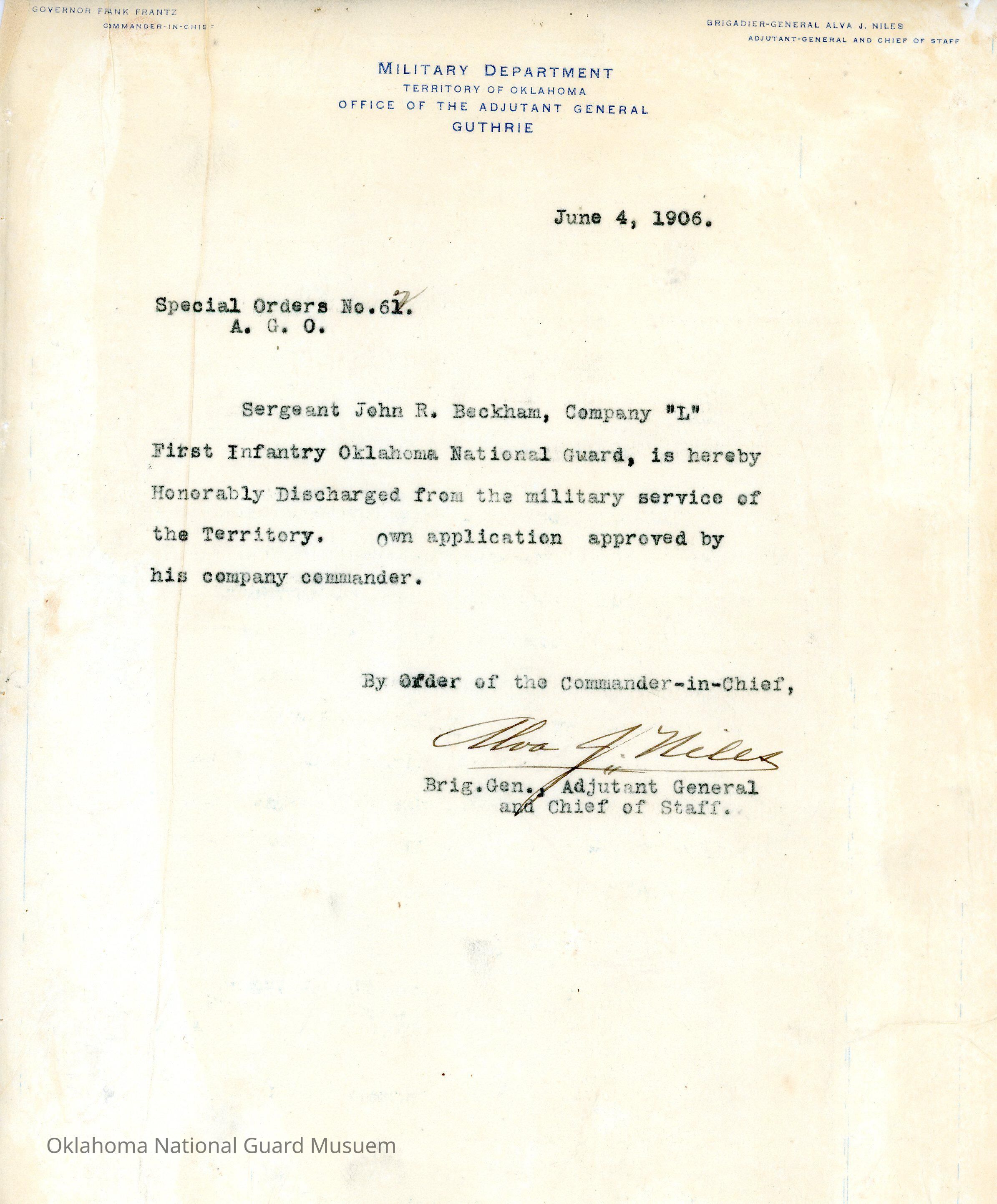 Adjutant General, Guthrie, Frank Frantz, Alva J. Niles, First Regiment, Honorable discharges, John R. Beckham