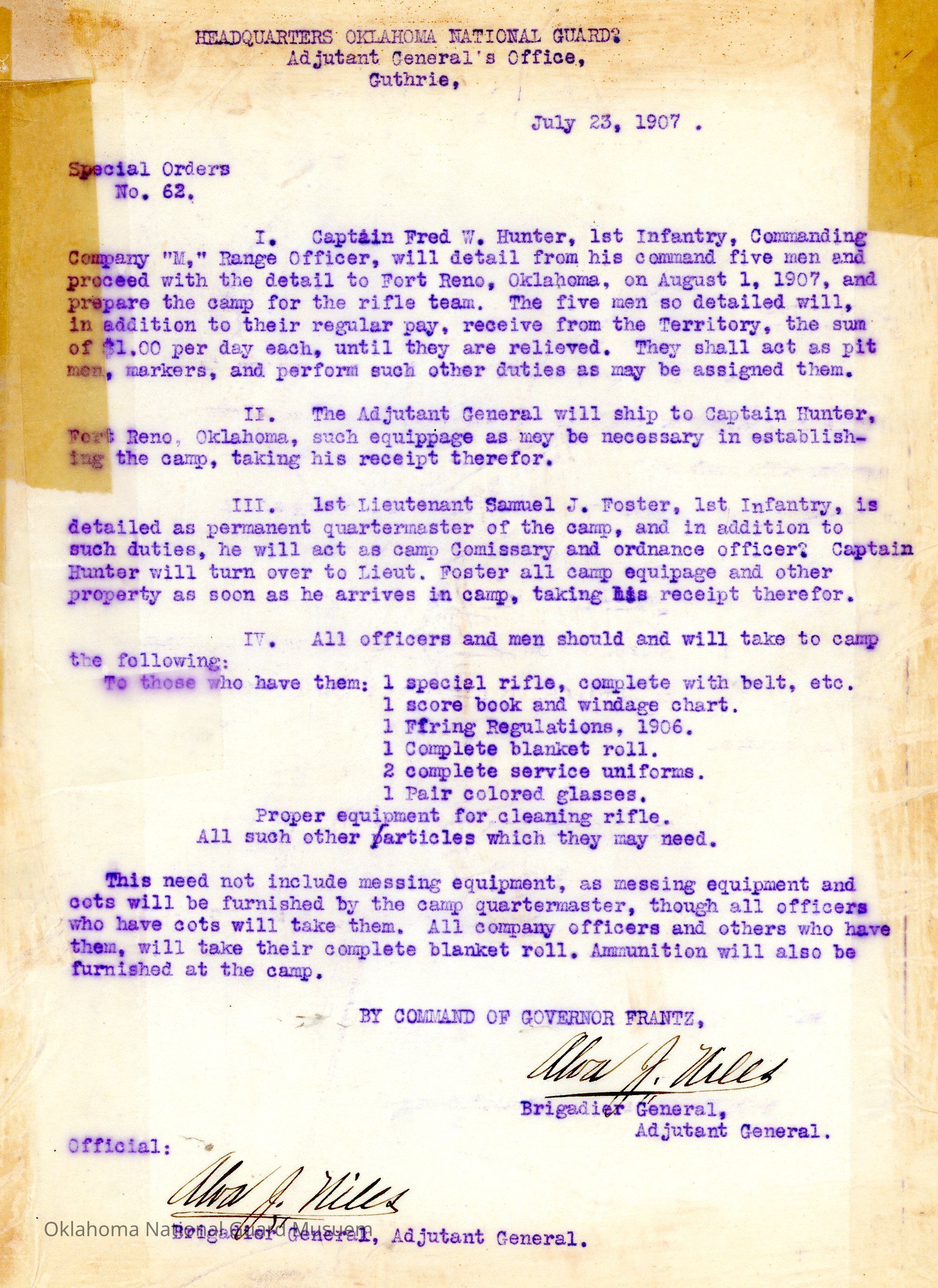 Adjutant General, Guthrie, Alva J. Niles, Rifle team, Fred W. Hunter, Fort Reno, Samuel J. Foster, Quartermaster, Frank Frantz