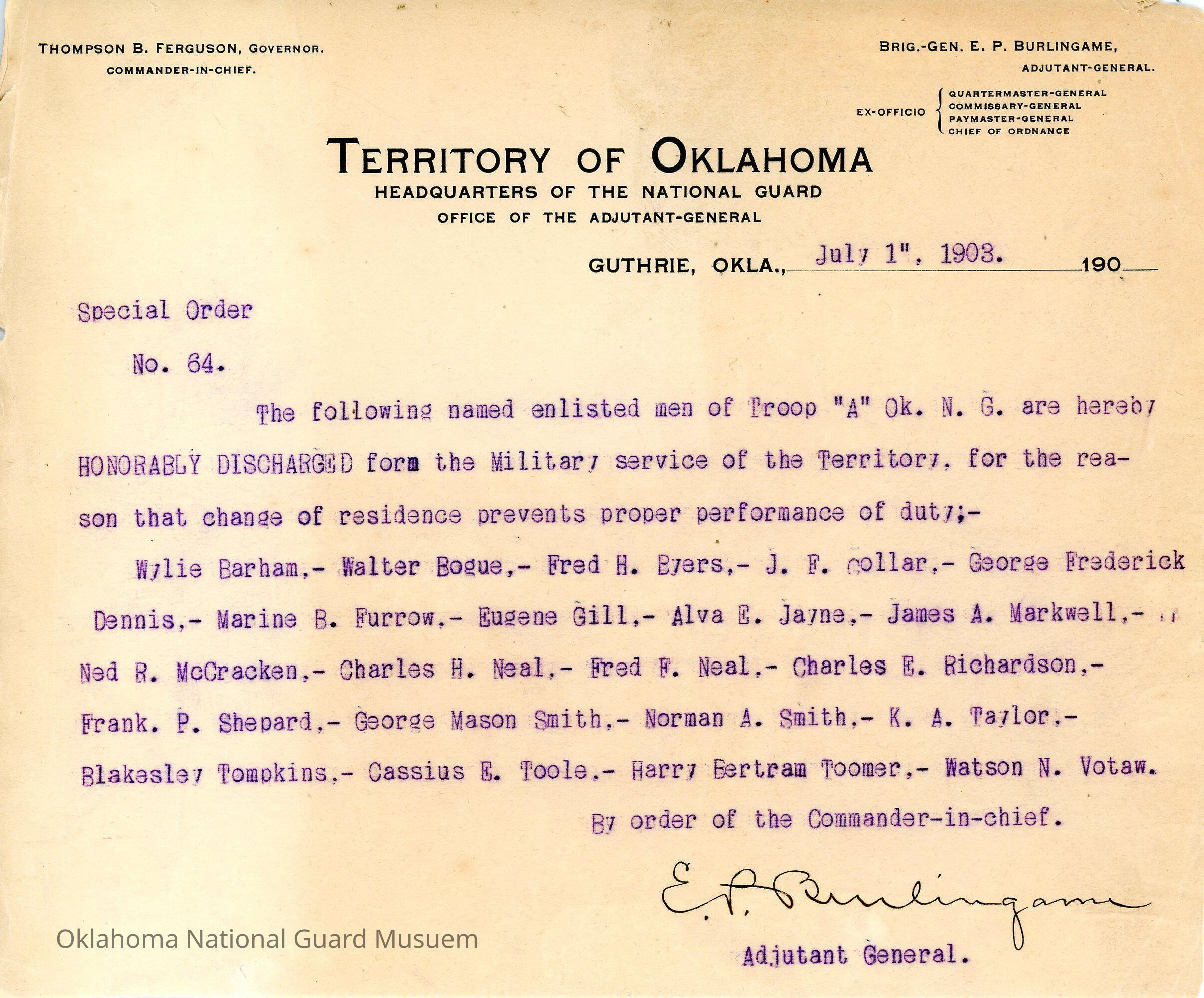 Special Order #64 from Headquarters Adjutant General's Office in Guthrie. The order lists men from Troop A that are honorably dischargedDate(s) of Creation
