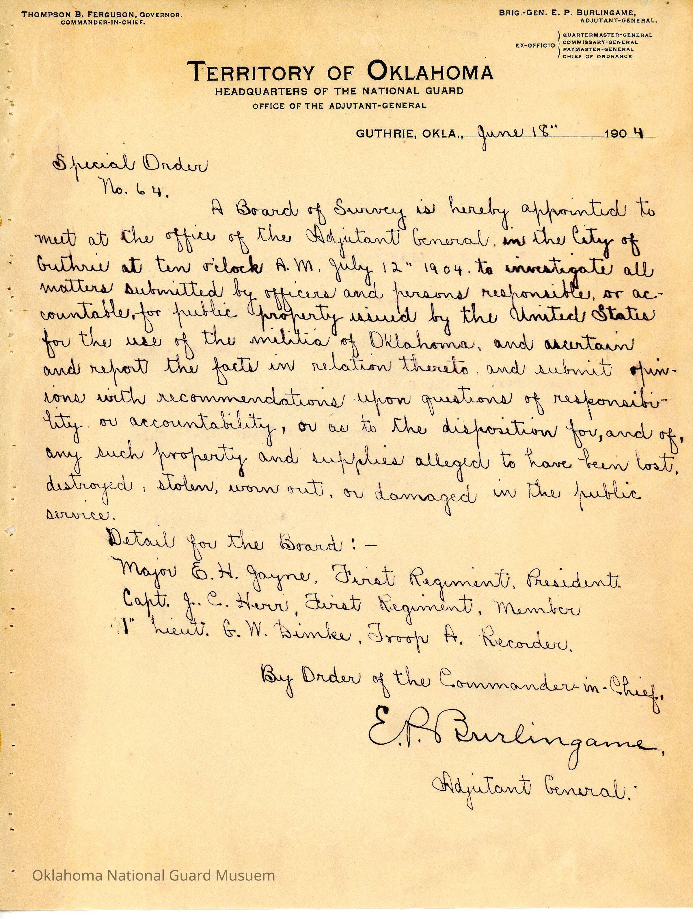 Special Order #64 from Headquarters Adjutant General's Office in Guthrie. The order appoints a Board of Survey to investigate all matters relating to public property issued by the federal government for use in the Oklahoma National Guard. HandwrittenDate(s) of Creation