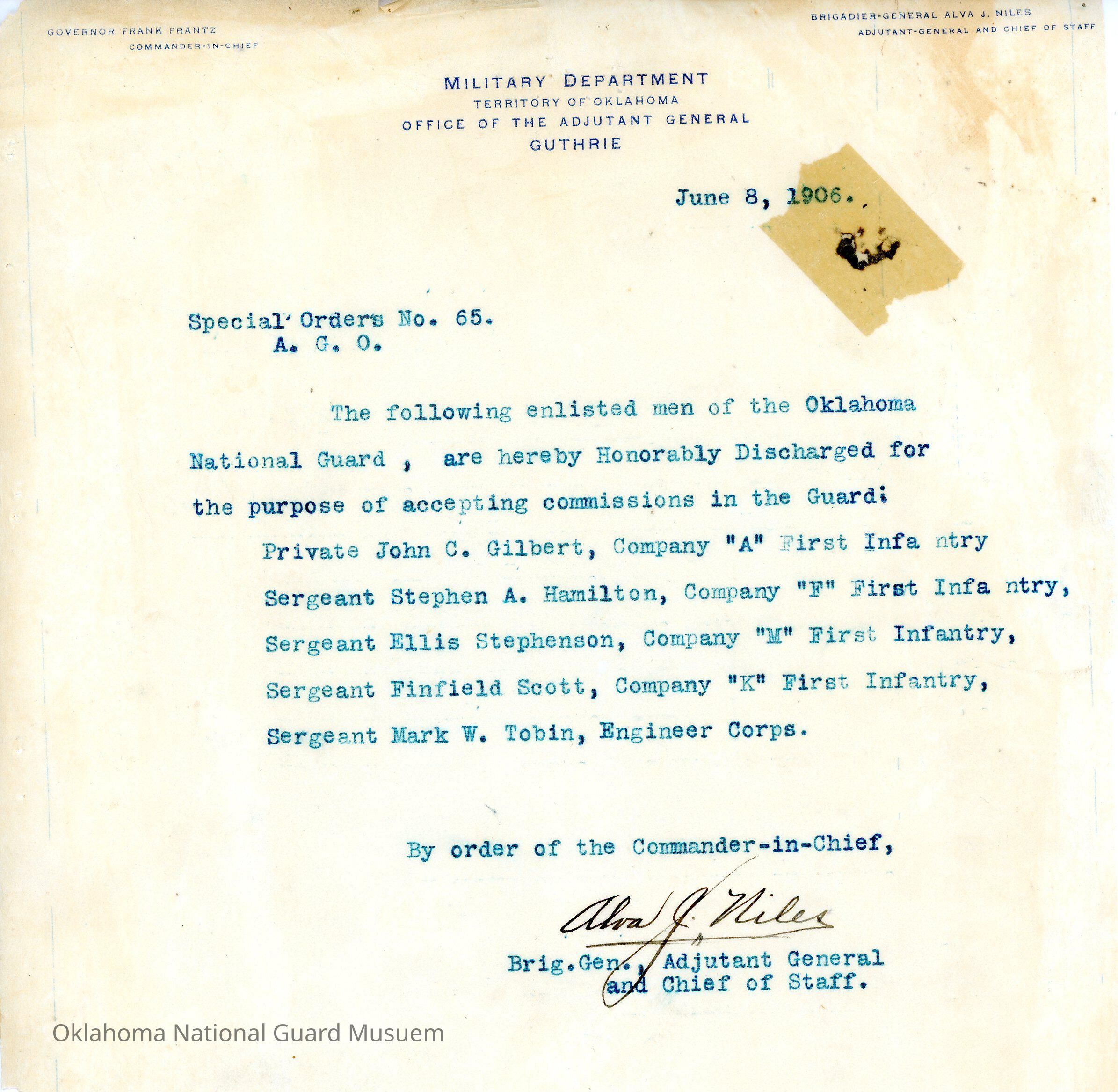 Adjutant General, Guthrie, Frank Frantz, Alva J. Niles, First Infantry, Honorable discharges, John C. Gilbert, Stephen A. Hamilton, Ellis Stephenson, Winfield Scott, Mark W. Tobin