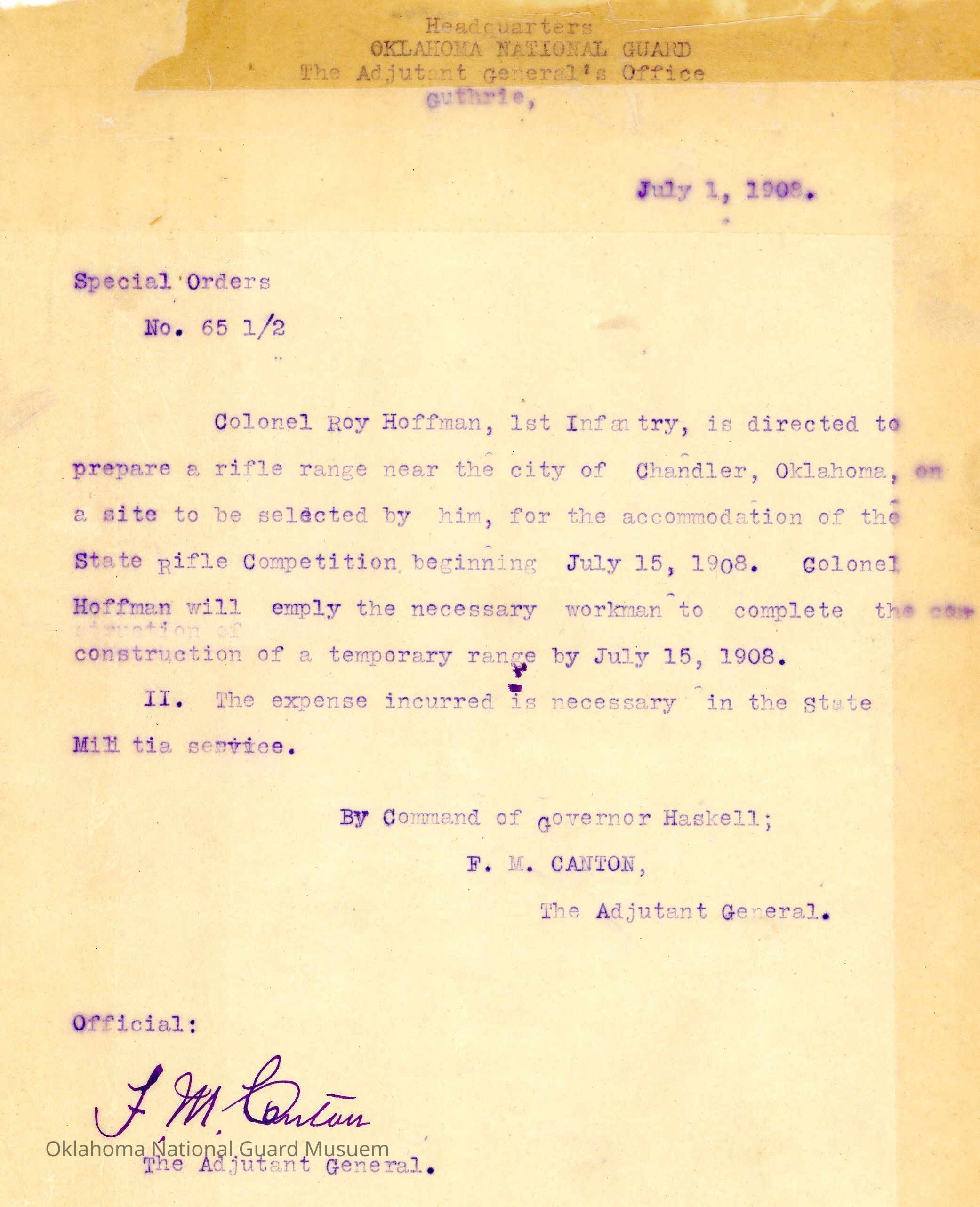 Special Order #65.5 from Headquarters Adjutant General's Office in Guthrie. The order instructs Roy Hoffman to proceed t0 Chandler to prepare rifle ranges for the State Rifle CompetitionDate(s) of Creation
