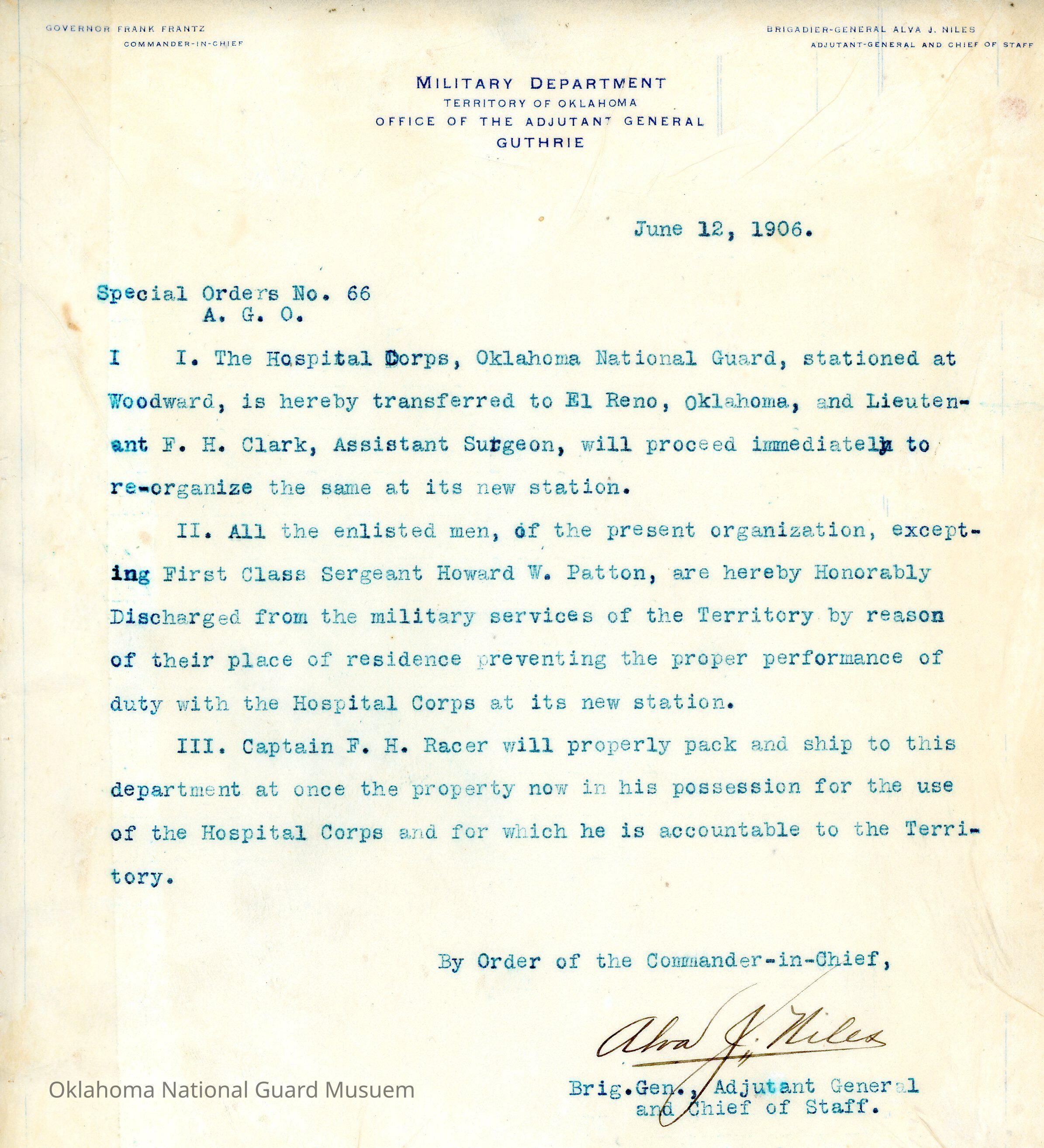 Adjutant General, Guthrie, Frank Frantz, Alva J. Niles, Hospital Corps, Station, Woodward, El Reno, Honorable discharges, F.H. Clark, Howard W. Patton, Property