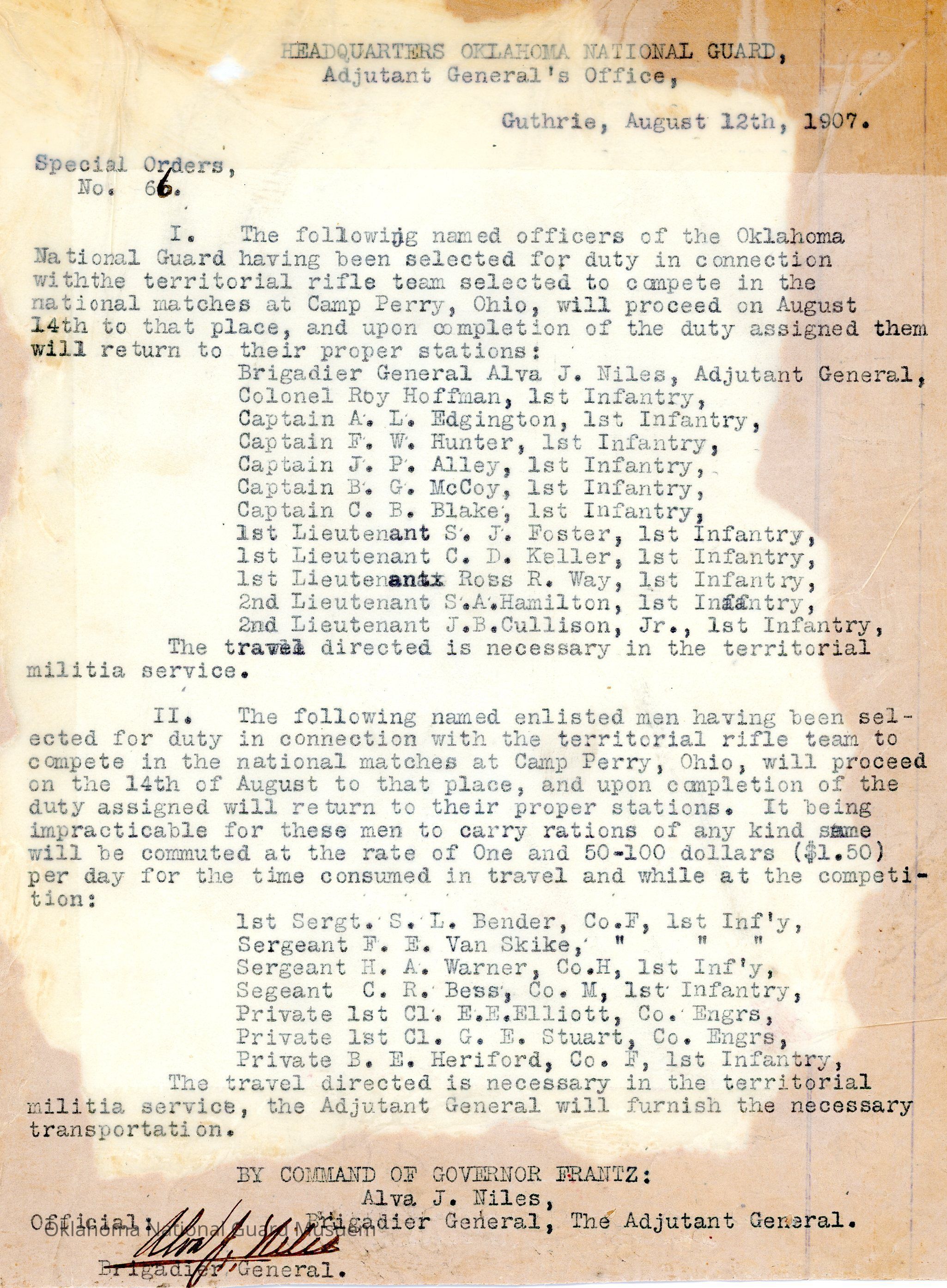 Adjutant General, Guthrie, Alva J. Niles, Camp Perry, Ohio, Roy Hoffman, A.L. Edgington, F.W. Hunter, J.P. Alley, B.G. McCoy, C.B. Blake, S.J. Foster, C.D. Keller, Ross R. Way, S.A. Hamilton, J.B. Cullison Jr, First Infantry, S.L. Bender, Company F, F.E. Van Skike, H.A. Warner, C.R. Bess, E.E. Elliott, Engineer Corps, Company H, Company M, G.E. Stuart, B.E. Heriford, Frank Frantz