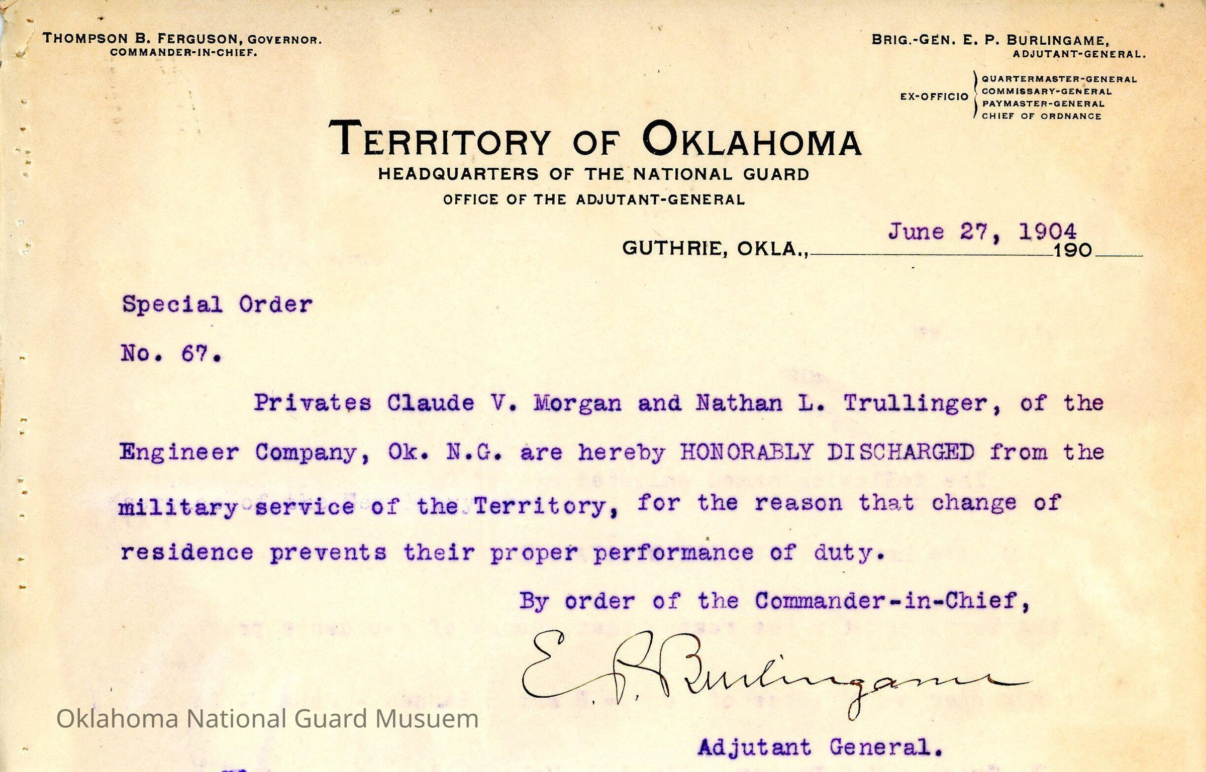 Adjutant General, Guthrie, E.P. Burlingame, Thompson B. Ferguson, Engineer Company, Honorable discharges, Claude V. Morgan, Nathan L. Trullinger