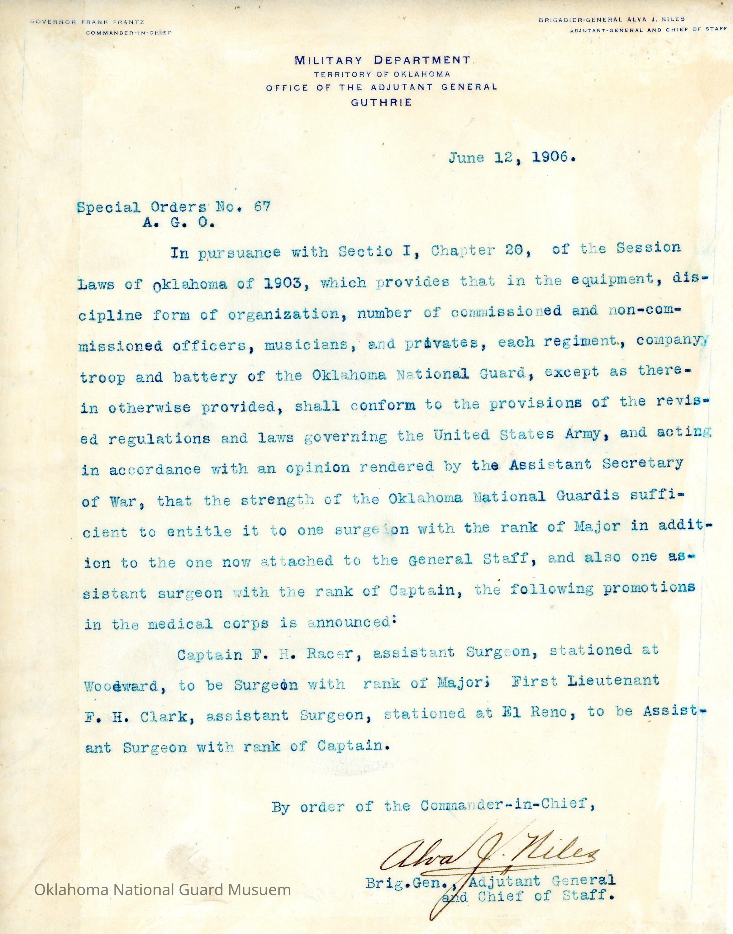 Adjutant General, Guthrie, Frank Frantz, Alva J. Niles, Hospital Corps, Promotions, F.H. Racer, Surgeon, F.H. Clark