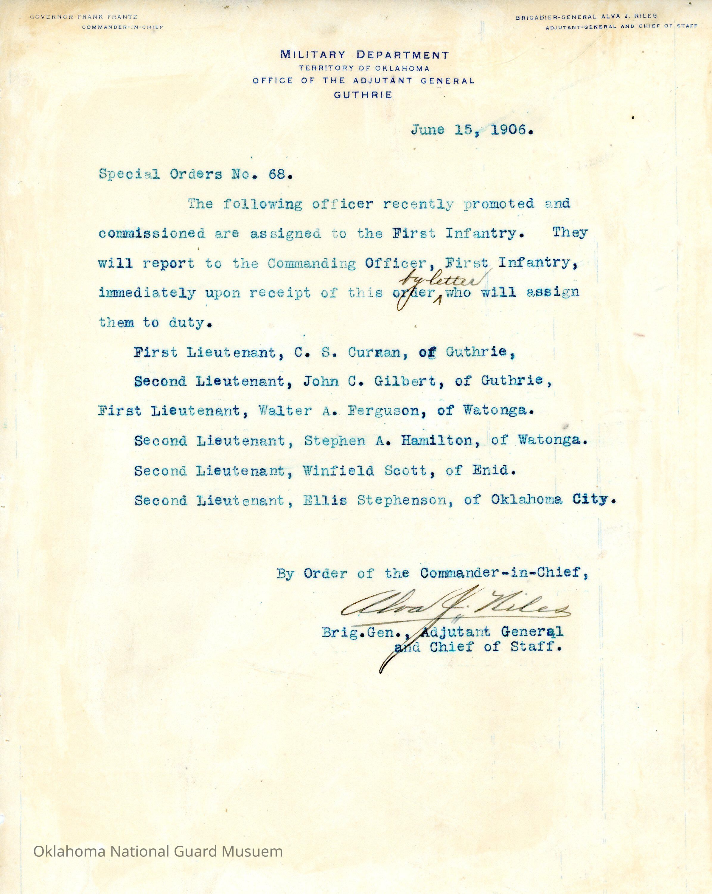 Special Order #68 from Headquarters Adjutant General's Office in Guthrie. The order assigns officers recently promoted to the First InfantryDate(s) of Creation