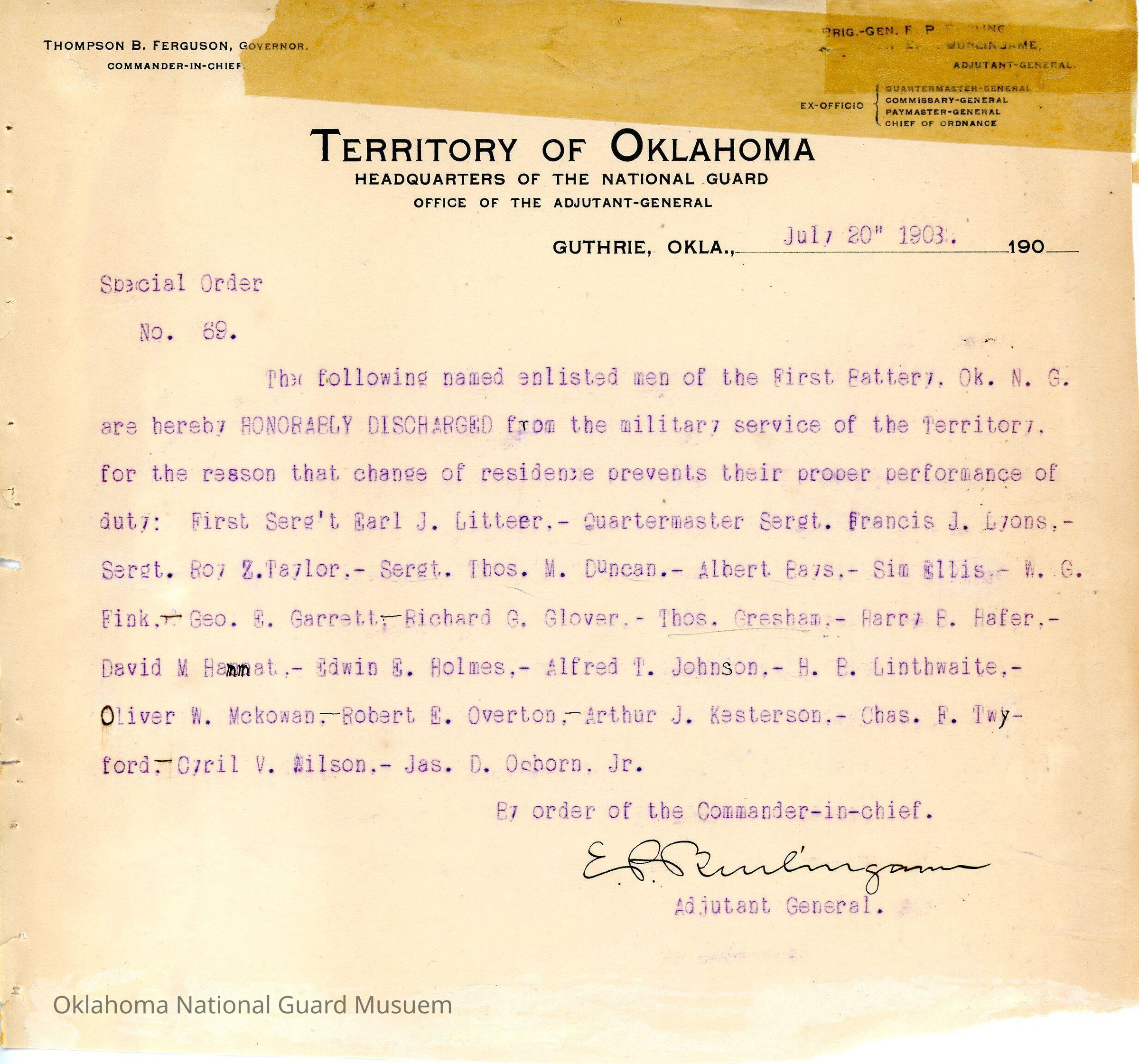 Adjutant General, Guthrie, E.P. Burlingame, Thompson B. Ferguson, Honorable discharge, First Battery, Earl J. Litteer, Francis J. Lyons, Roy Z. Taylor, Thomas M. Duncan, Albert Bays, Sim Ellis, W.G. Fink, George E. Garrett, Richard G. Glover, Thomas Gresham, Harry B. Hafer, David M. Hammat, Edwin E. Holmes, Alfred T. Johnson, H.B. Linthwaite, Oliver W. McKowan, Robert E. Overton, Arthur J. Kesterson, Charles F. Twyford, Cyrill V. Wilson, James D. Osborn Jr.