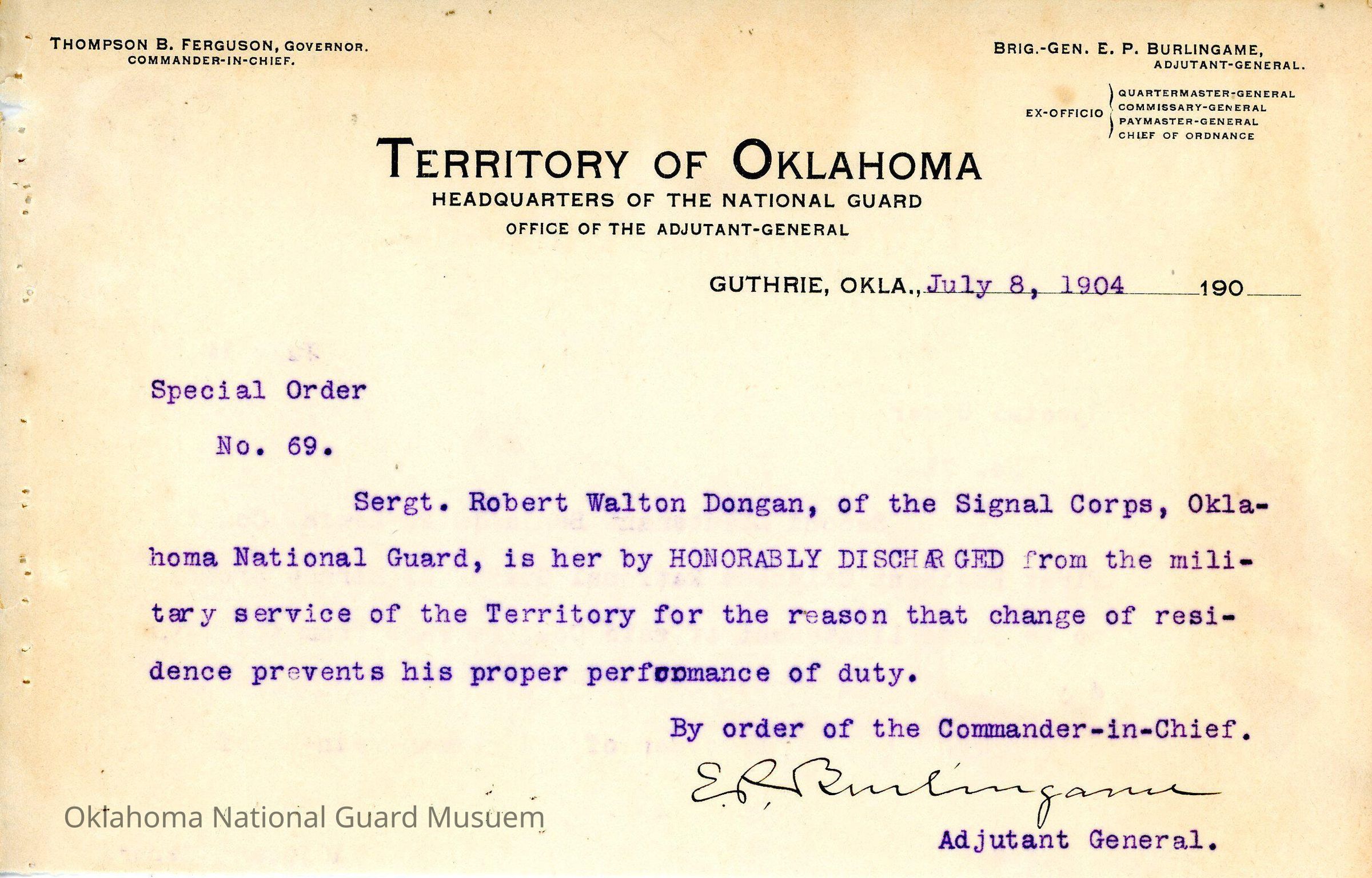Adjutant General, Guthrie, E.P. Burlingame, Thompson B. Ferguson, Signal Company, Honorable discharges, Robert Walton Dongan