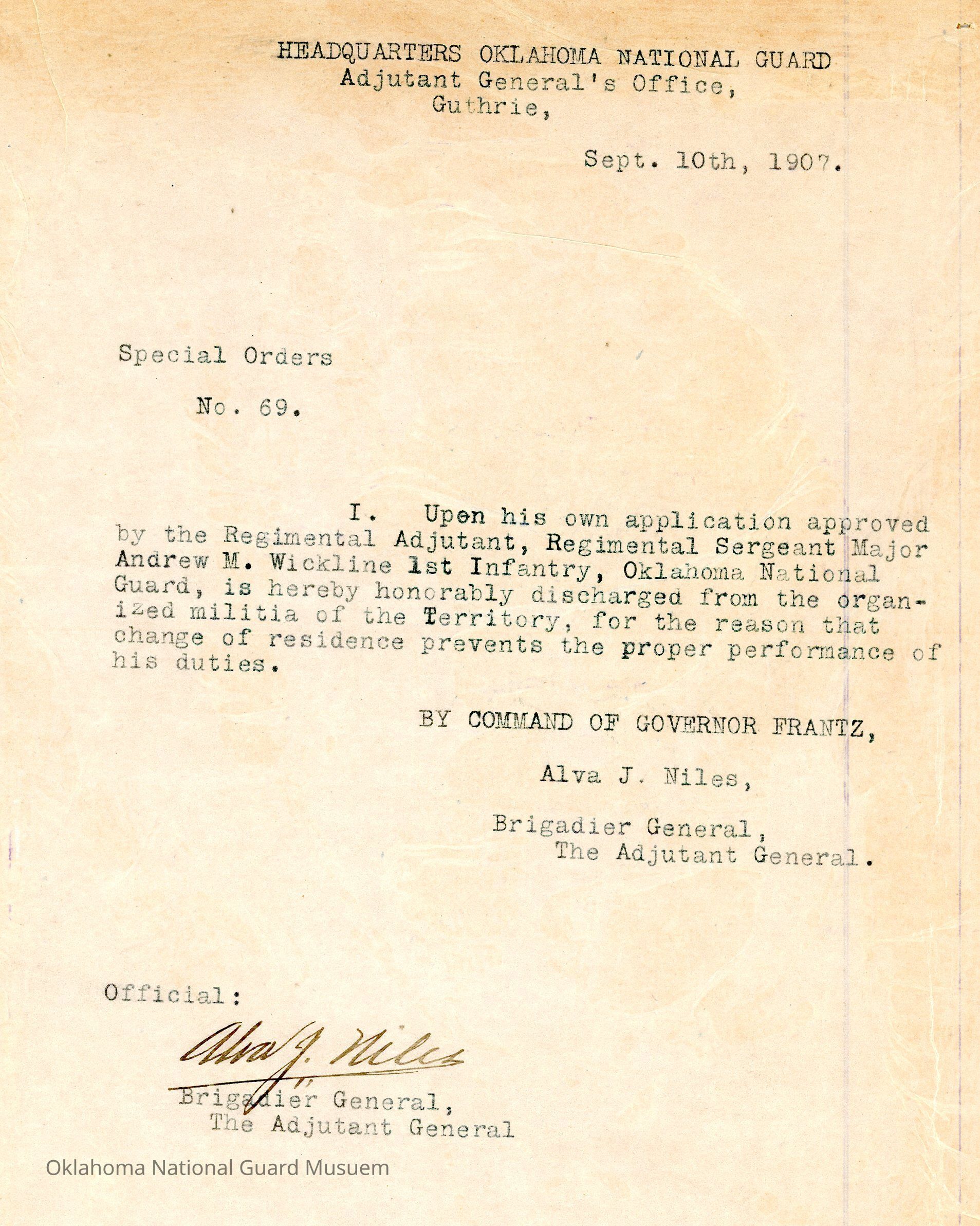 Adjutant General, Guthrie, Alva J. Niles, Honorable discharges, First Infantry, Andrew M. Wickline, Frank Frantz