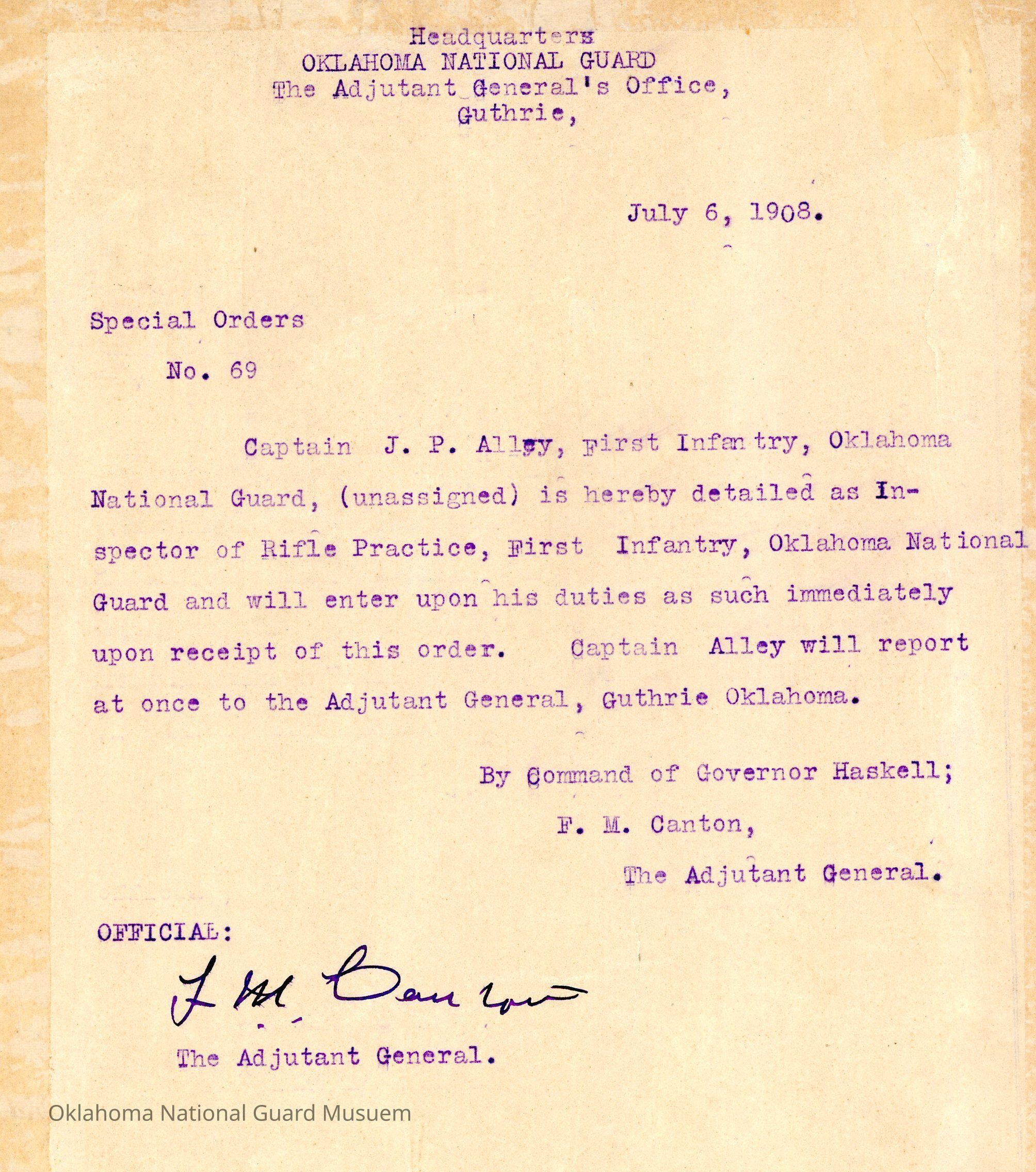 Special Order #69 from Headquarters Adjutant General's Office in Guthrie. The order appoints J.P. Alley as the inspector of the rifle practiceDate(s) of Creation