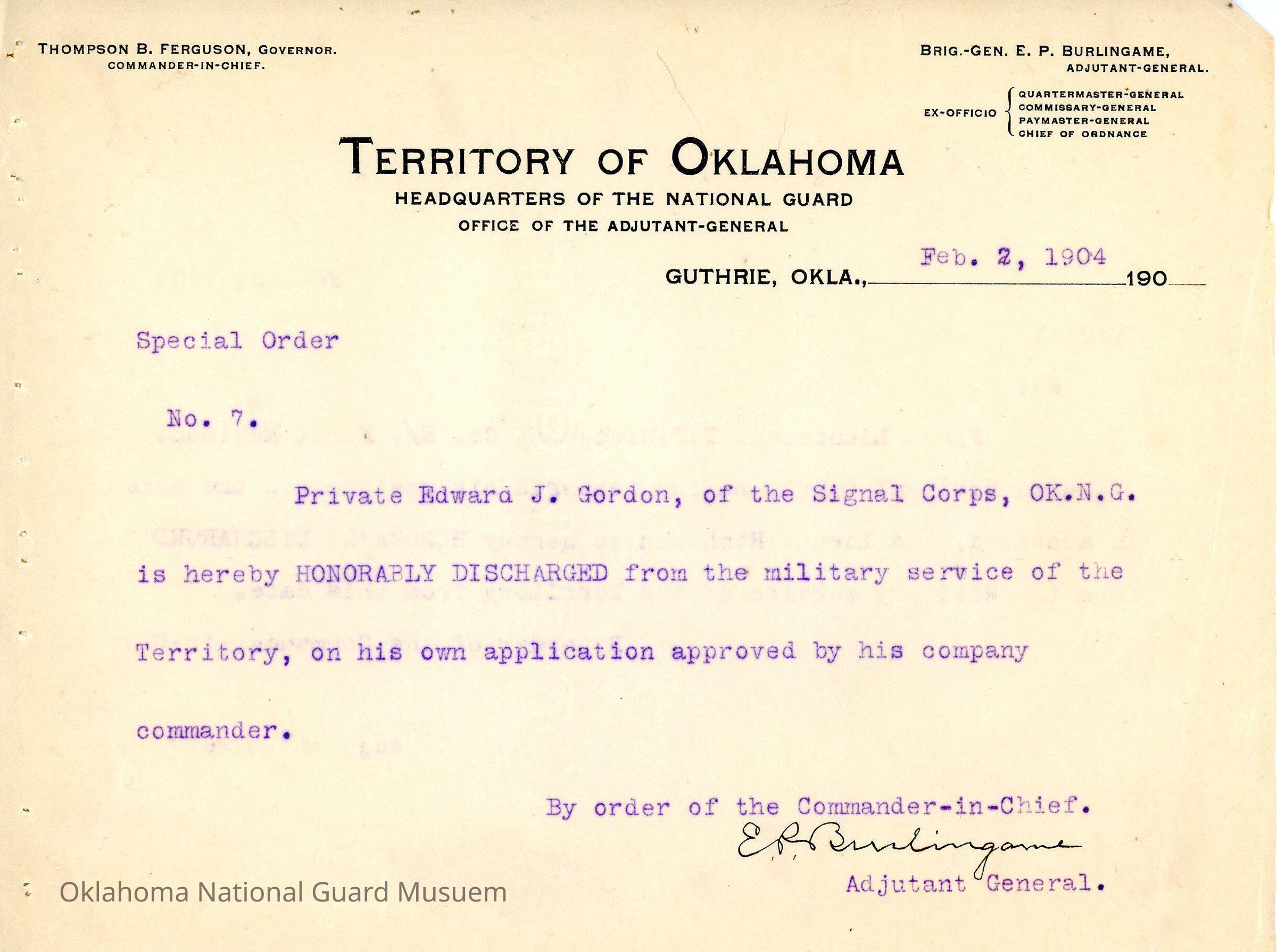 Adjutant General, Guthrie, E.P. Burlingame, Thompson B. Ferguson, Signal Corps, Honorable discharges, Edward J. Gordon