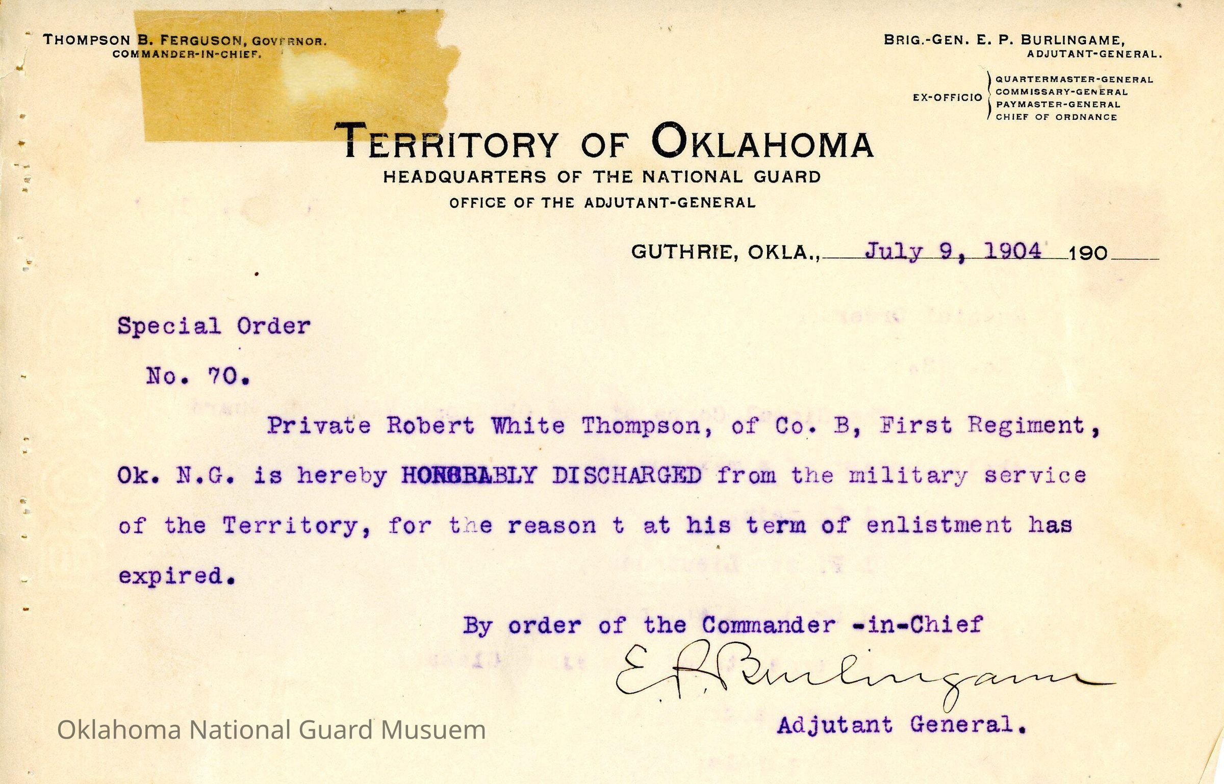Adjutant General, Guthrie, E.P. Burlingame, Thompson B. Ferguson, First Regiment, Honorable discharges, Robert White Thompson