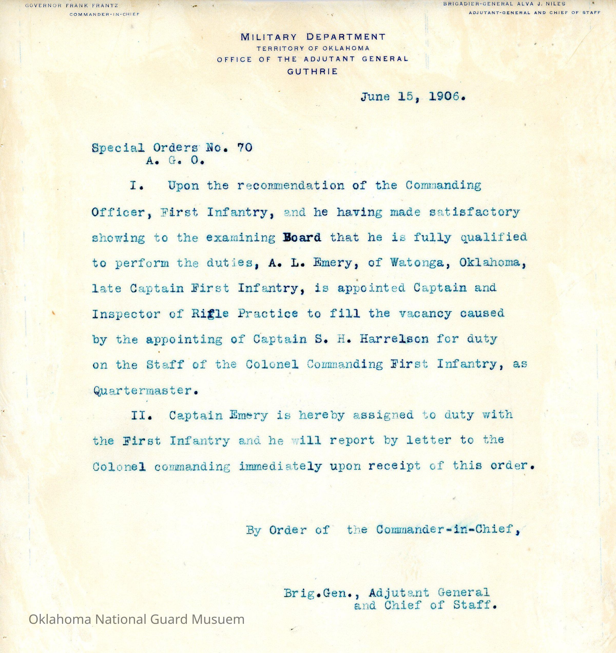 Adjutant General, Guthrie, Frank Frantz, Alva J. Niles, First Regiment, Honorable discharges, Resignation, Inspector of rifle practice, A.L. Emery, S.H. Harrelson, Watonga