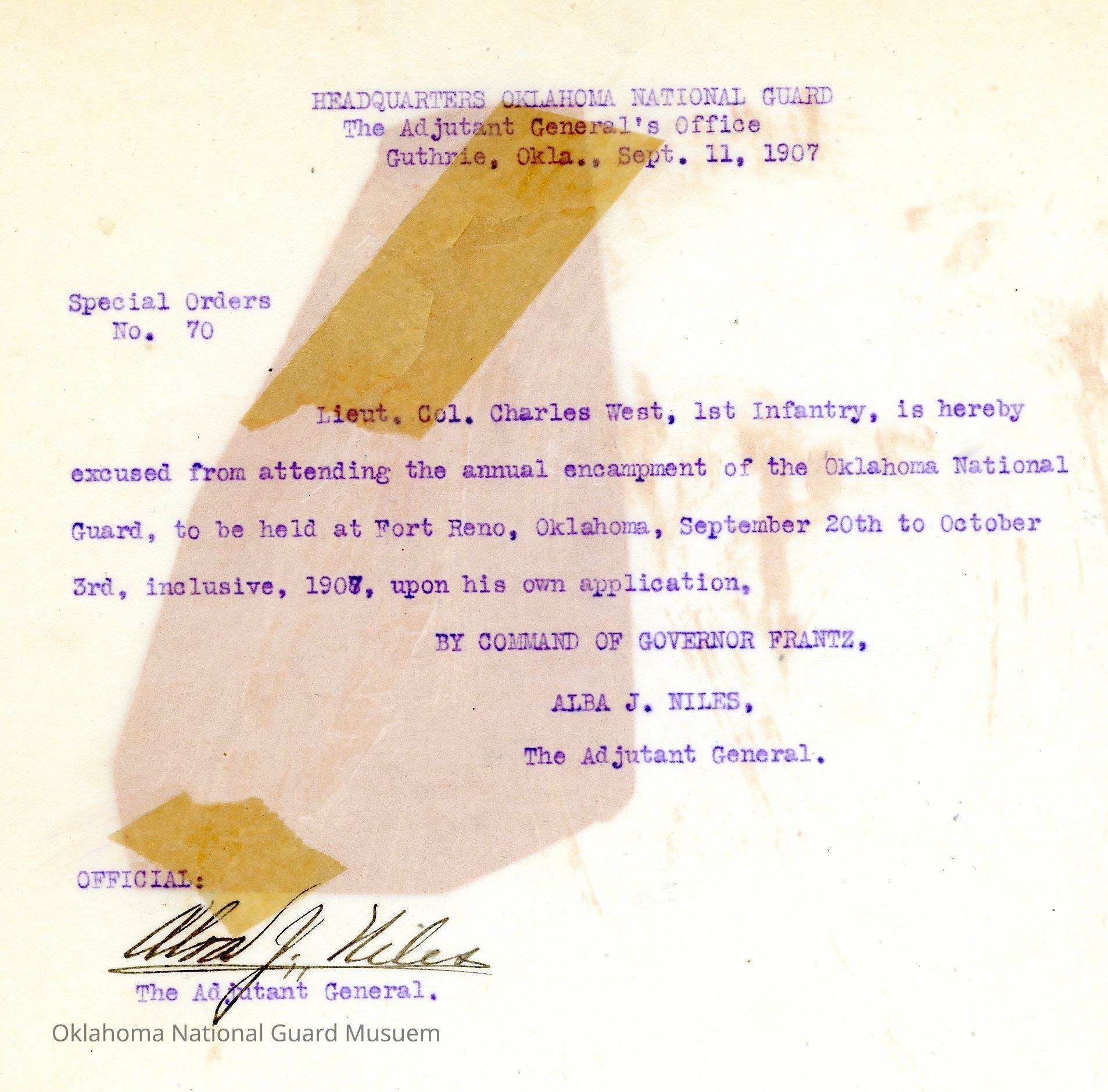 Special Order #70 from Headquarters Adjutant General's Office in Guthrie. The order excuses Charles West from attending the annual encampment at Fort RenoDate(s) of Creation